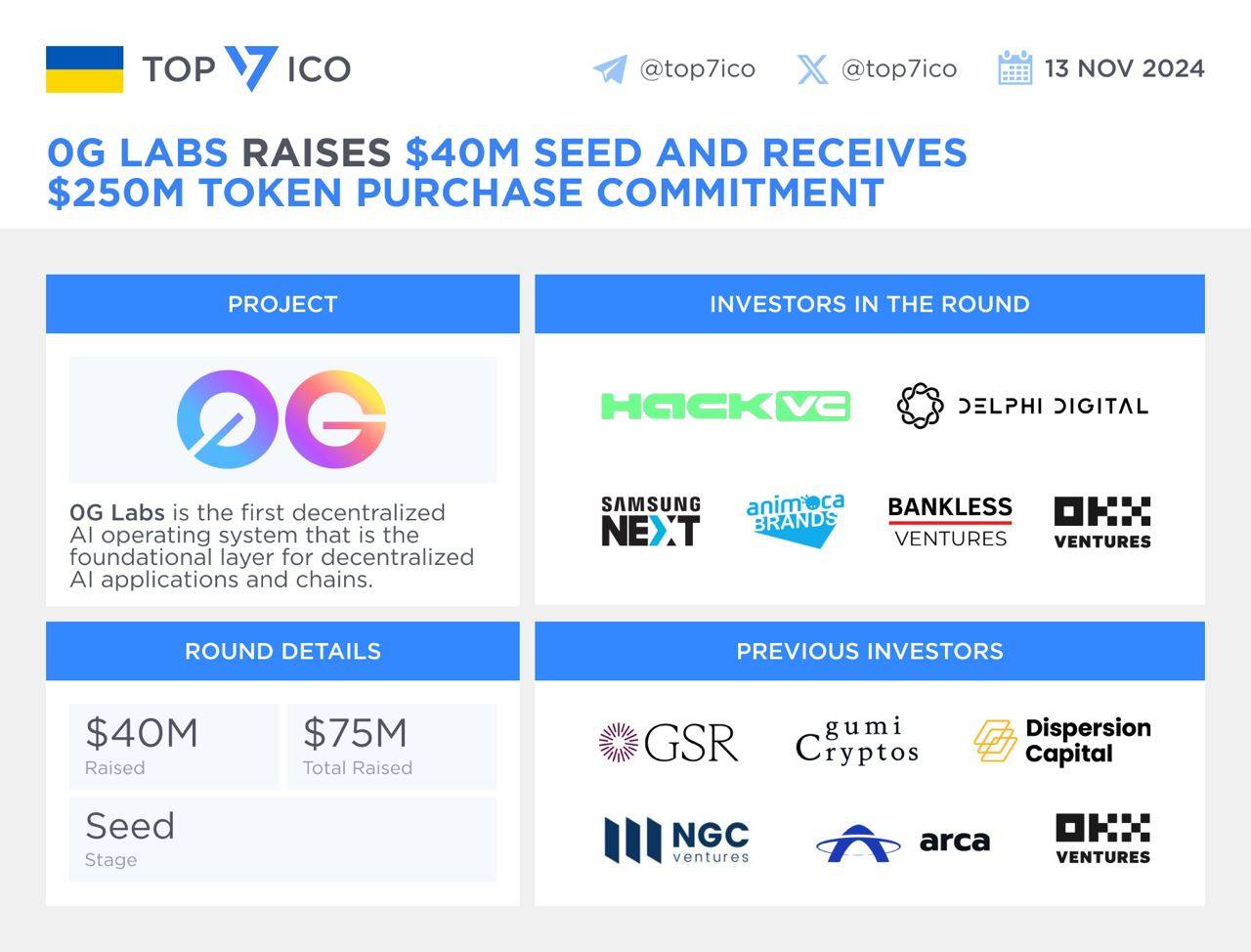 0G Labs đã huy động được 75 triệu USD từ các quỹ đầu tư như Delphi, Animoca, OKX Ventures, Alliance DAO, Symbolic Capital,... Ngoài ra còn có thỏa thuận mua token 250 triệu USD với 0G Foundation, tổ chức quản trị độc lập của giao thức.