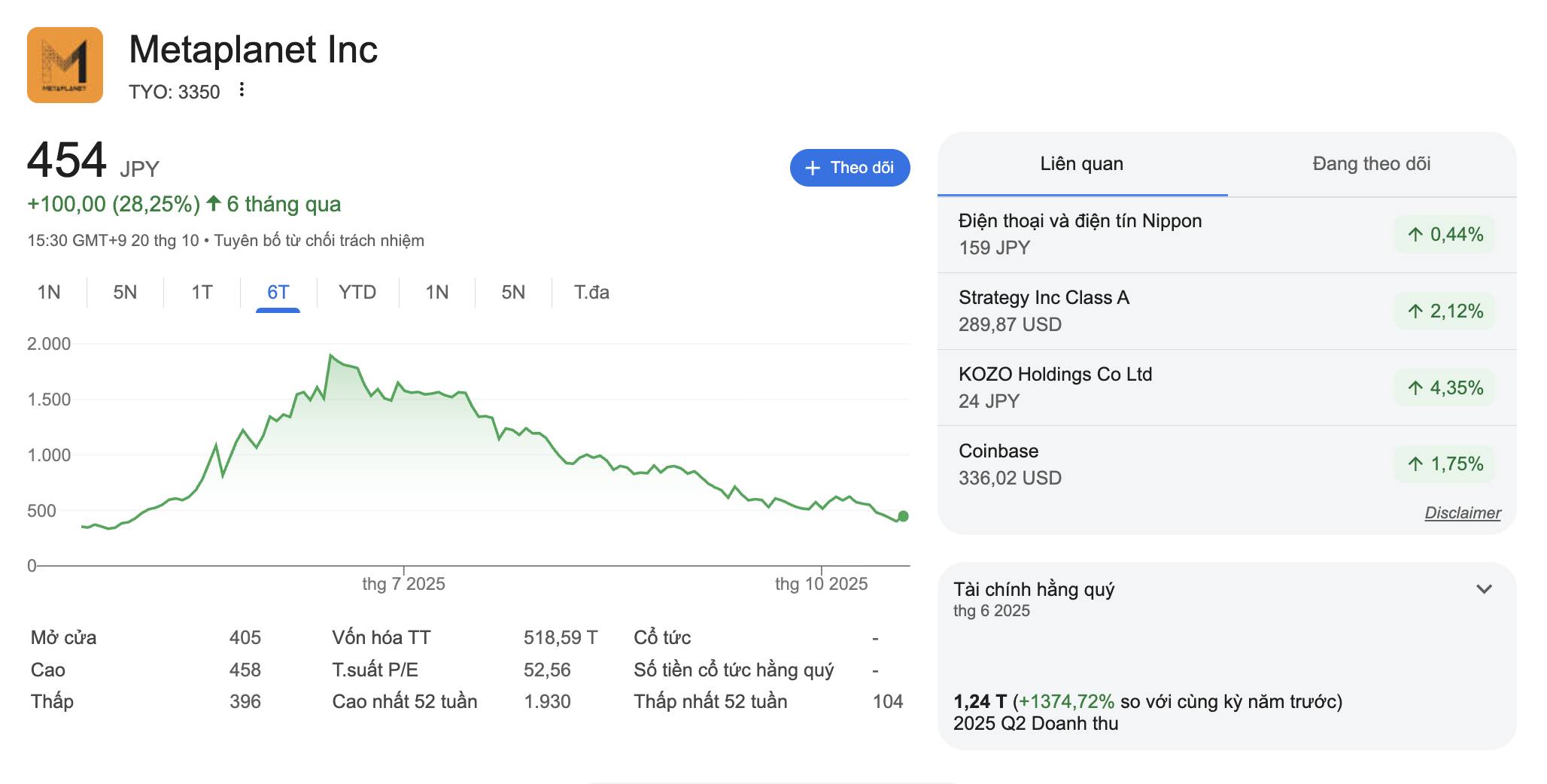 - Ví dụ tiêu biểu là cổ phiếu Metaplanet đã giảm mạnh 76% trong 6 tháng qua, từ mức 1.895 yên xuống chỉ còn 454 yên tại thời điểm viết bài.