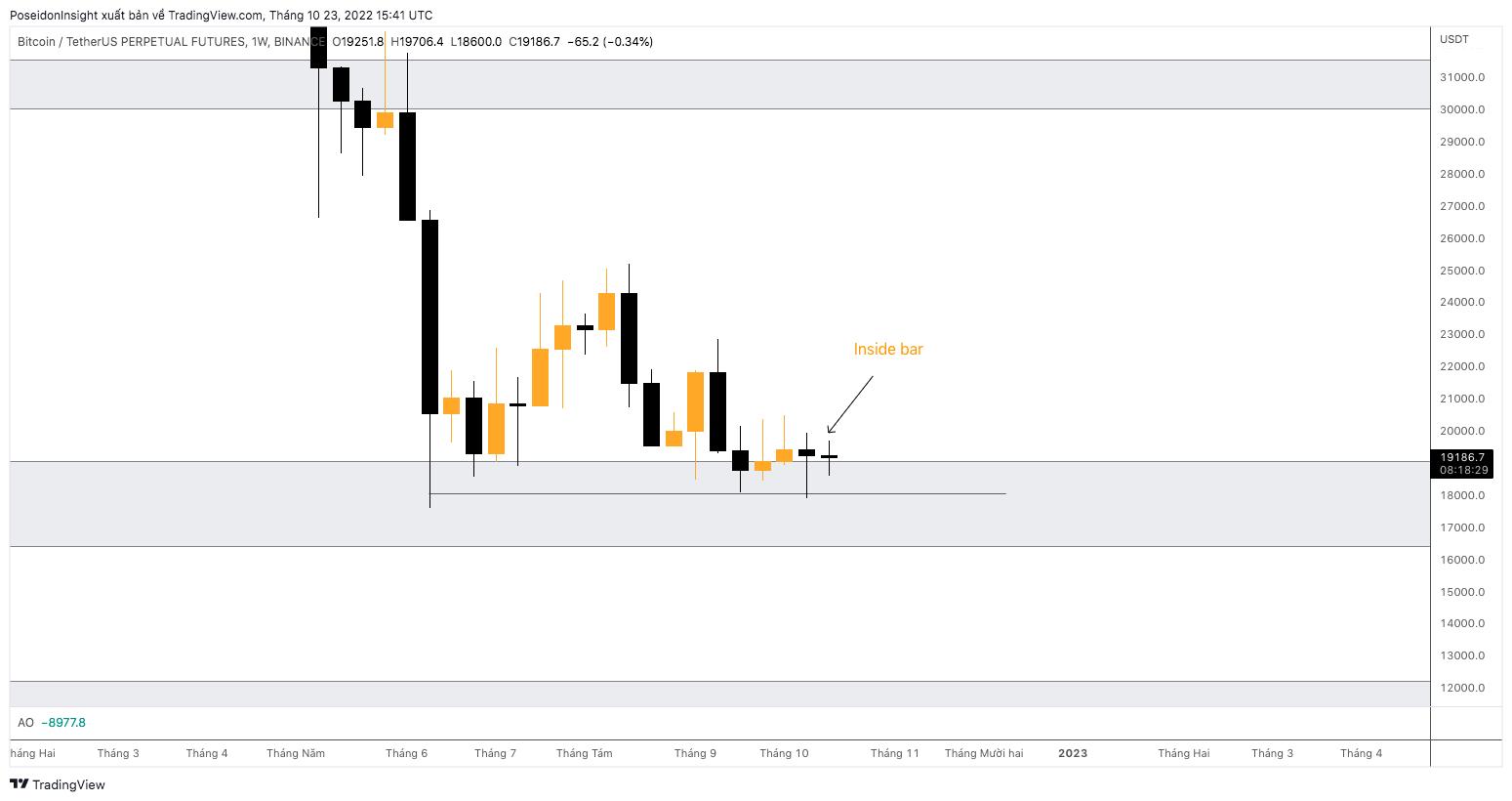Không có khác biệt gì trên khung W khi mà giá vẫn đang chững lại quanh vùng 18.500 – 19.500 USD (đây là một vùng cầu mạnh, như mình đã phân tích trong plan tuần trước. Điểm đáng chú ý trong tuần này là nếu không có gì đặc biệt xảy ra và nến tuần sẽ đóng với hình dạng tương tự như thời điểm hiện tại, chúng ta sẽ có một mô hình Inside Bar.