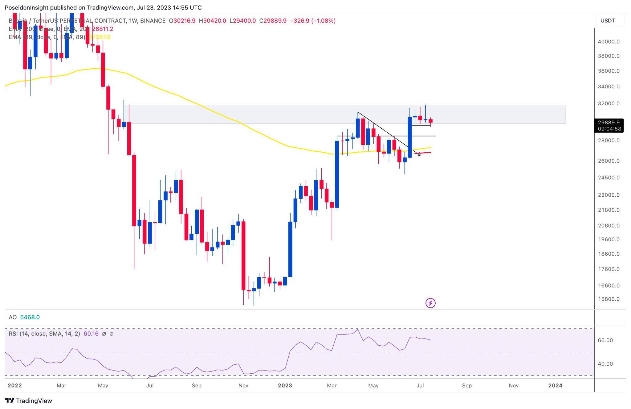 Đồ thị 1W của cặp BTC/USDT trên sàn Binance Futures, ảnh chụp màn hình TradingView vào tối ngày 23/07/2023