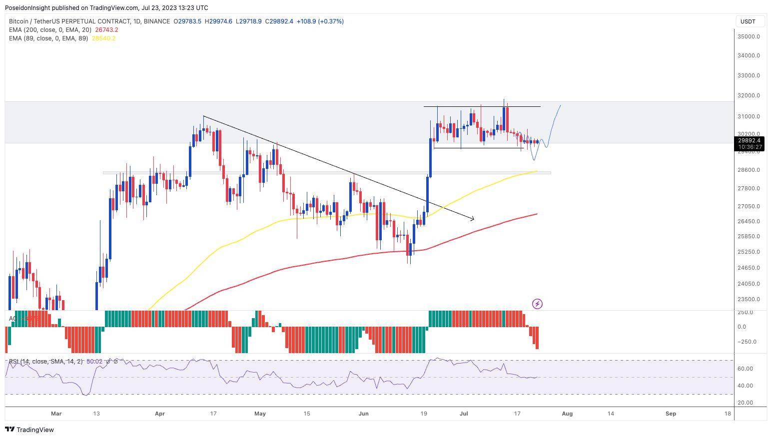 Đồ thị 1D của cặp BTC/USDT trên sàn Binance Futures, ảnh chụp màn hình TradingView vào tối ngày 23/07/2023