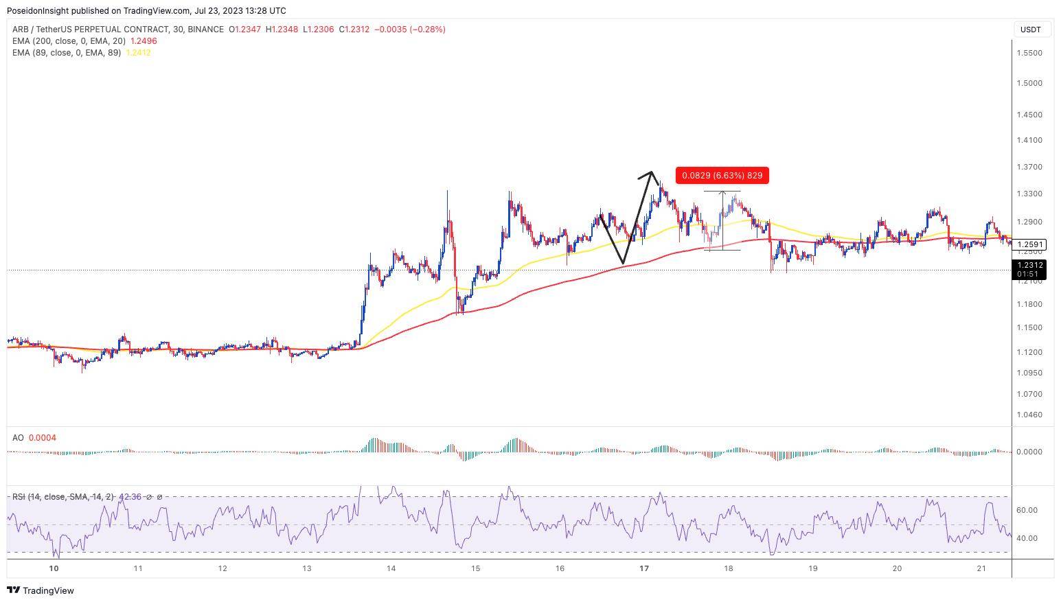 Đồ thị 30m của cặp ARB/USDT trên sàn Binance Futures, ảnh chụp màn hình TradingView vào tối ngày 23/07/2023