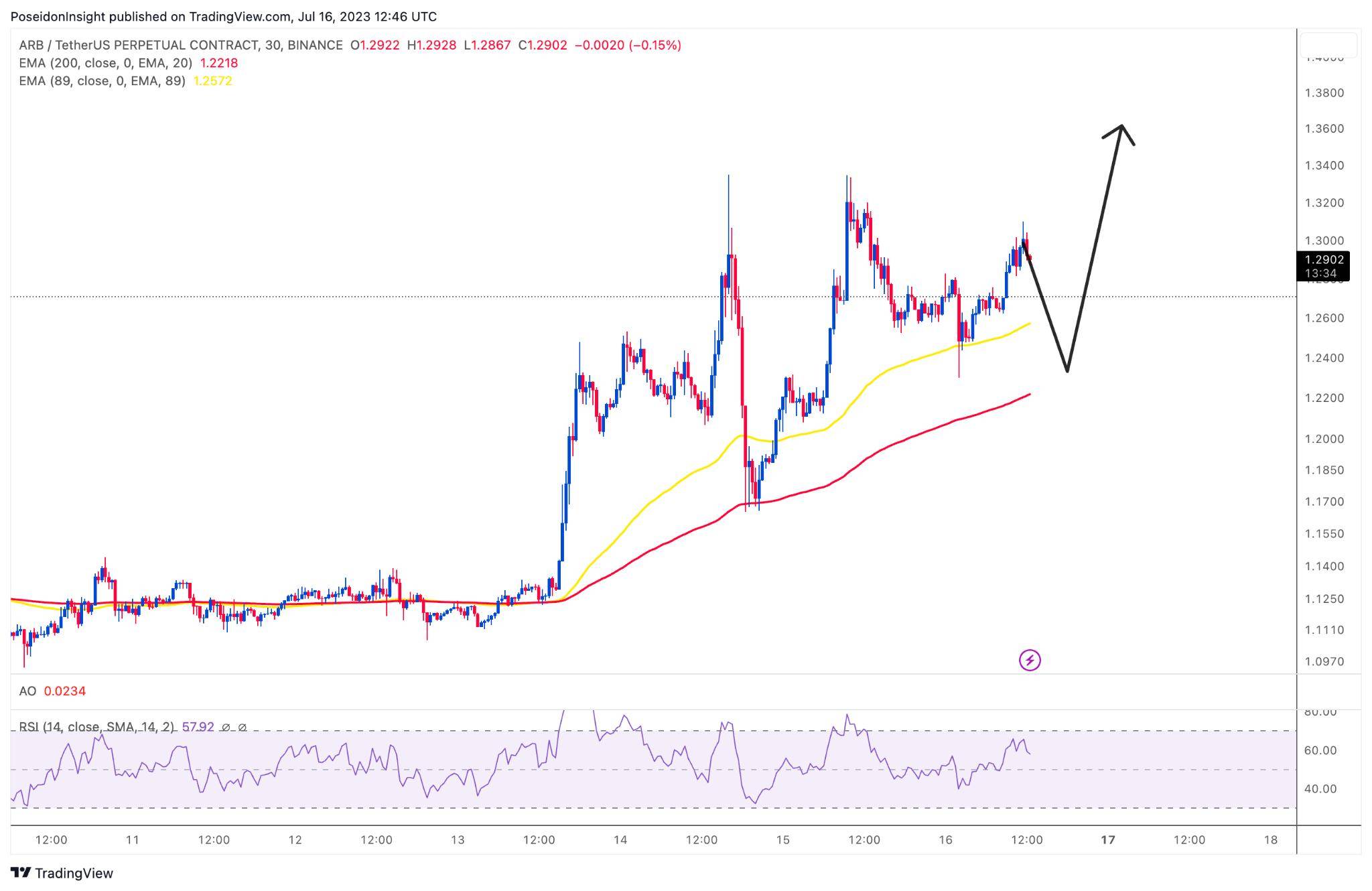 Đồ thị 30m của cặp ARB/USDT trên sàn Binance Futures, ảnh chụp màn hình TradingView vào tối ngày 16/07/2023