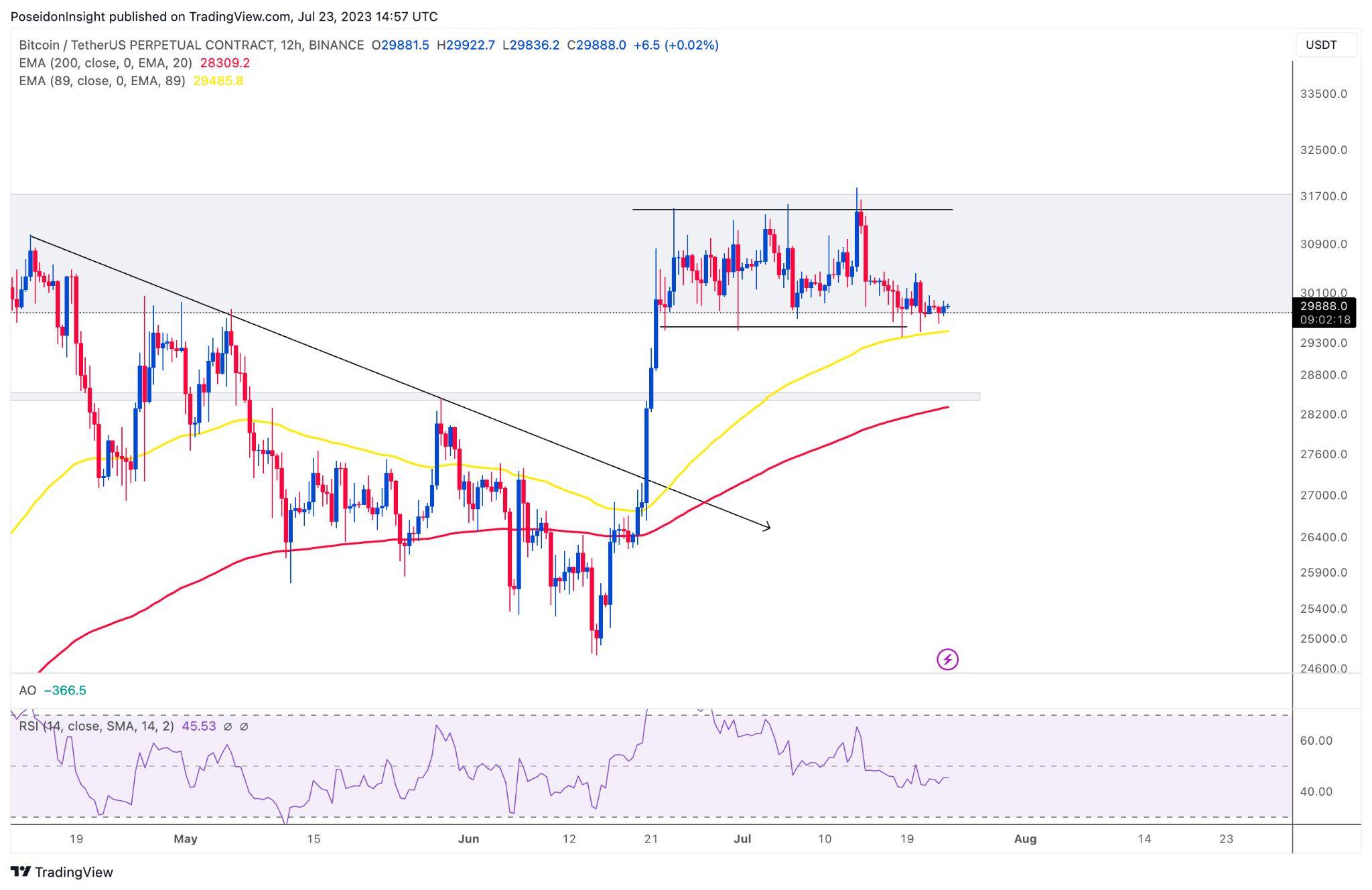 Đồ thị 12h của cặp BTC/USDT trên sàn Binance Futures, ảnh chụp màn hình TradingView vào tối ngày 23/07/2023