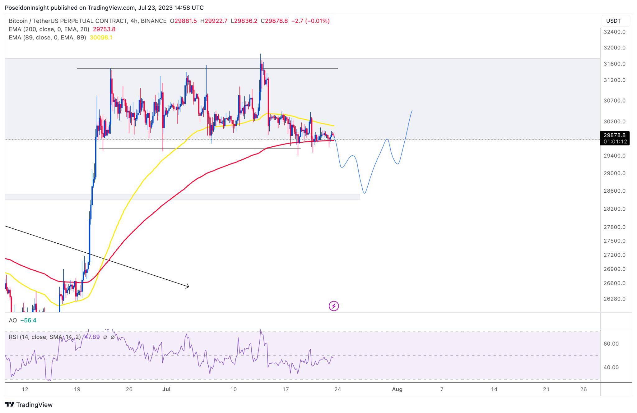 Đồ thị 4h của cặp BTC/USDT trên sàn Binance Futures, ảnh chụp màn hình TradingView vào tối ngày 23/07/2023