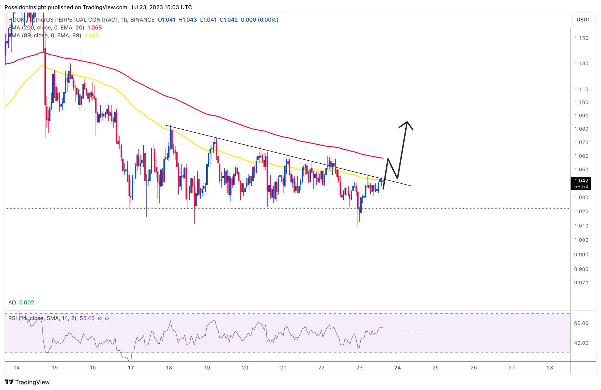 Đồ thị 1h của cặp HOOK/USDT trên sàn Binance Futures, ảnh chụp màn hình TradingView vào tối ngày 23/07/2023