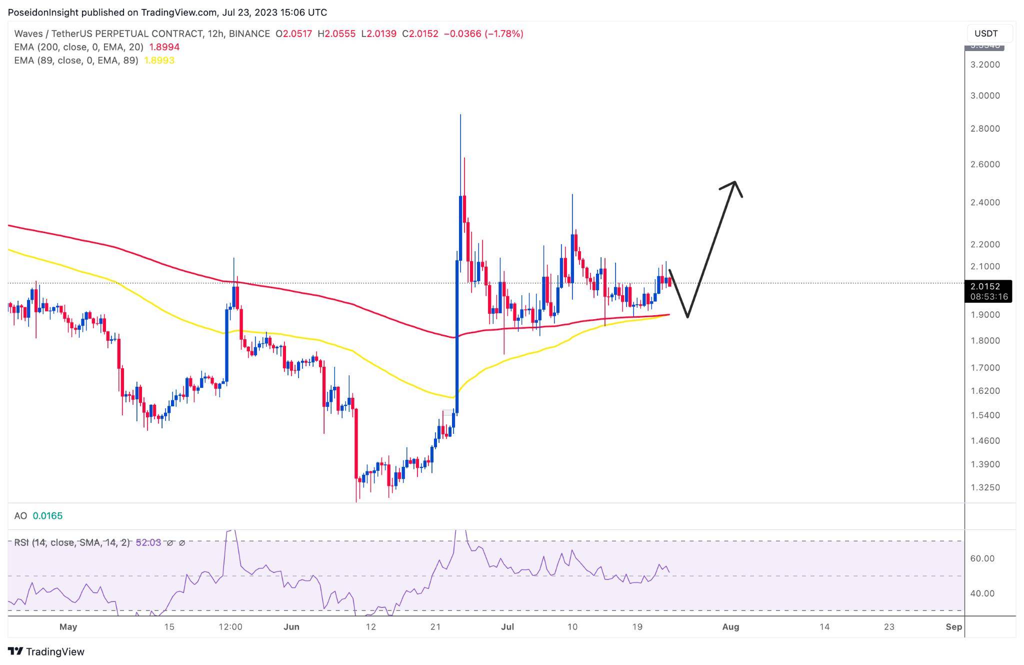 Đây cũng là đồng coin có biểu đồ khá ổn. Giá sau khi bật tăng mạnh đã điều chỉnh và đang sideway quanh vùng 1.9 - 2.1 USD. Anh em có thể đợi giá điều chỉnh về 1.9 để mua spot với kỳ vọng giá sẽ tiếp tục quay lại theo động lượng tăng trước đó.
