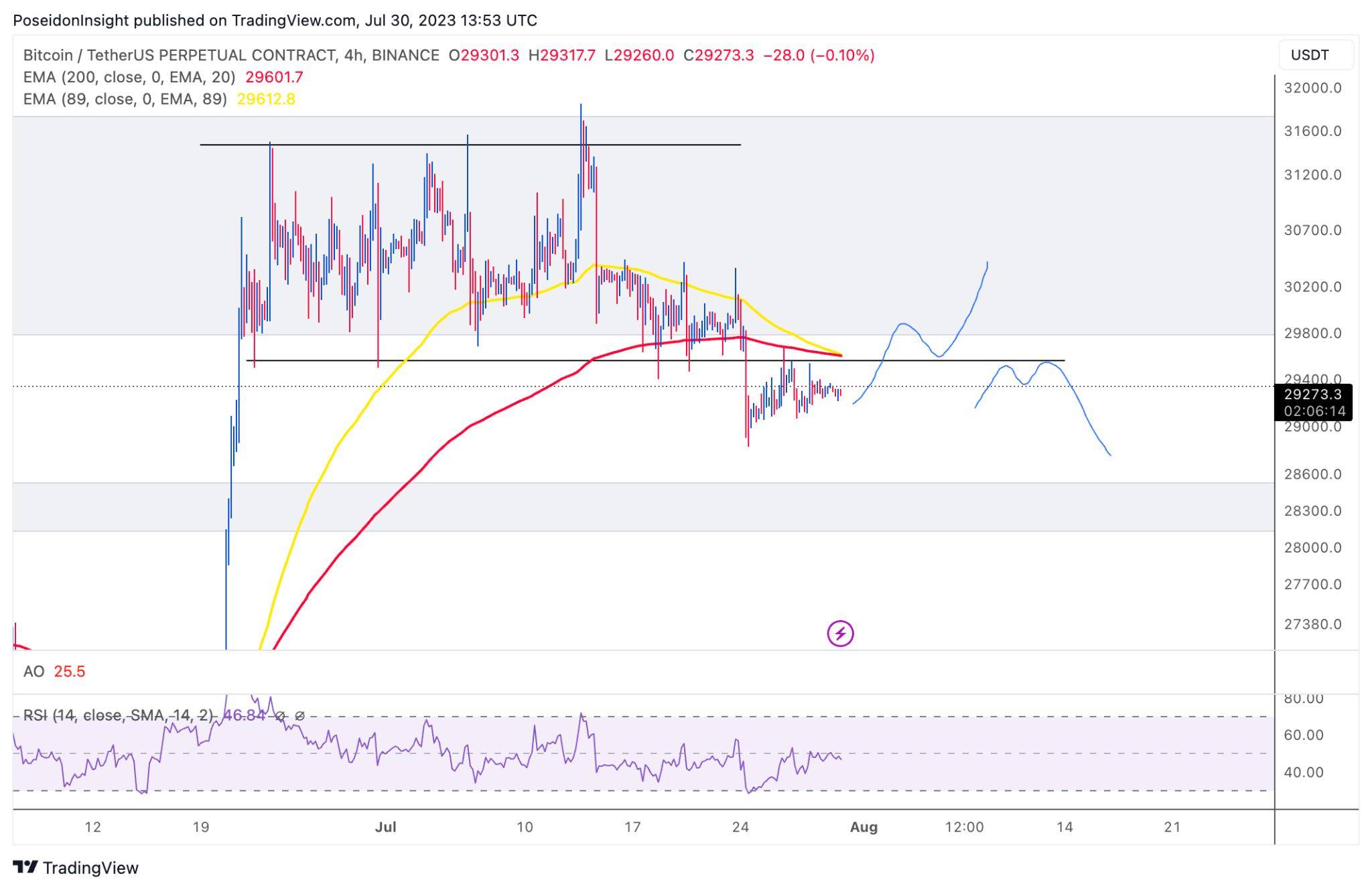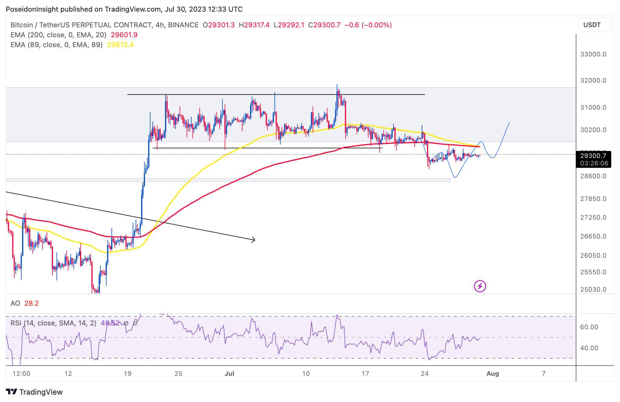 Đồ thị 4h của cặp BTC/USDT trên sàn Binance Futures, ảnh chụp màn hình TradingView vào tối ngày 30/07/2023