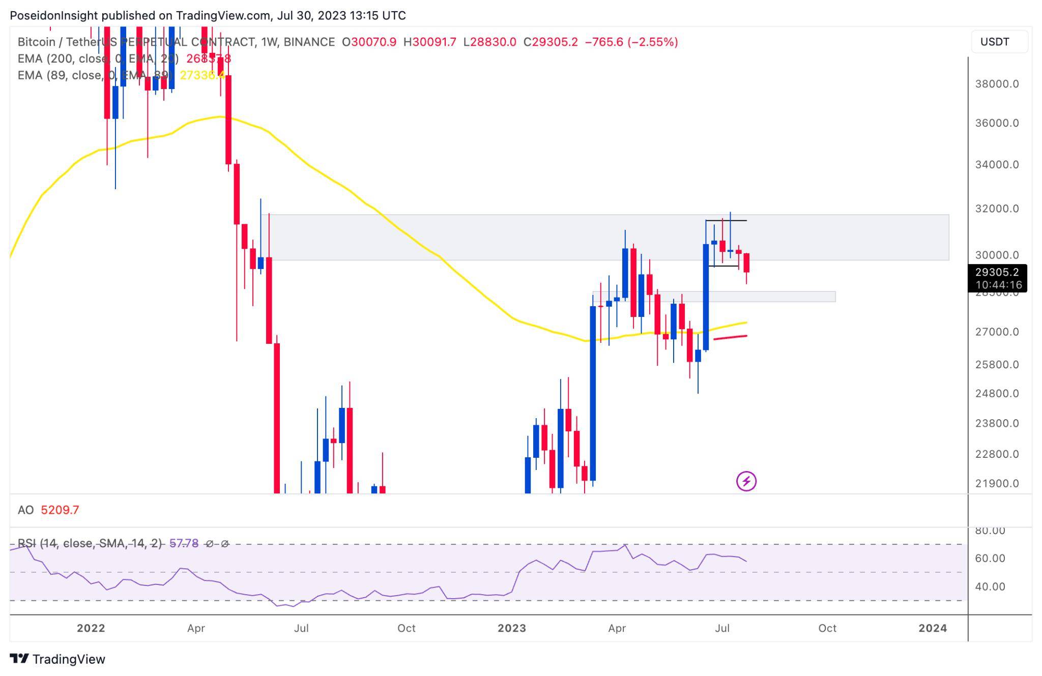 Đồ thị 1W của cặp BTC/USDT trên sàn Binance Futures, ảnh chụp màn hình TradingView vào tối ngày 30/07/2023
