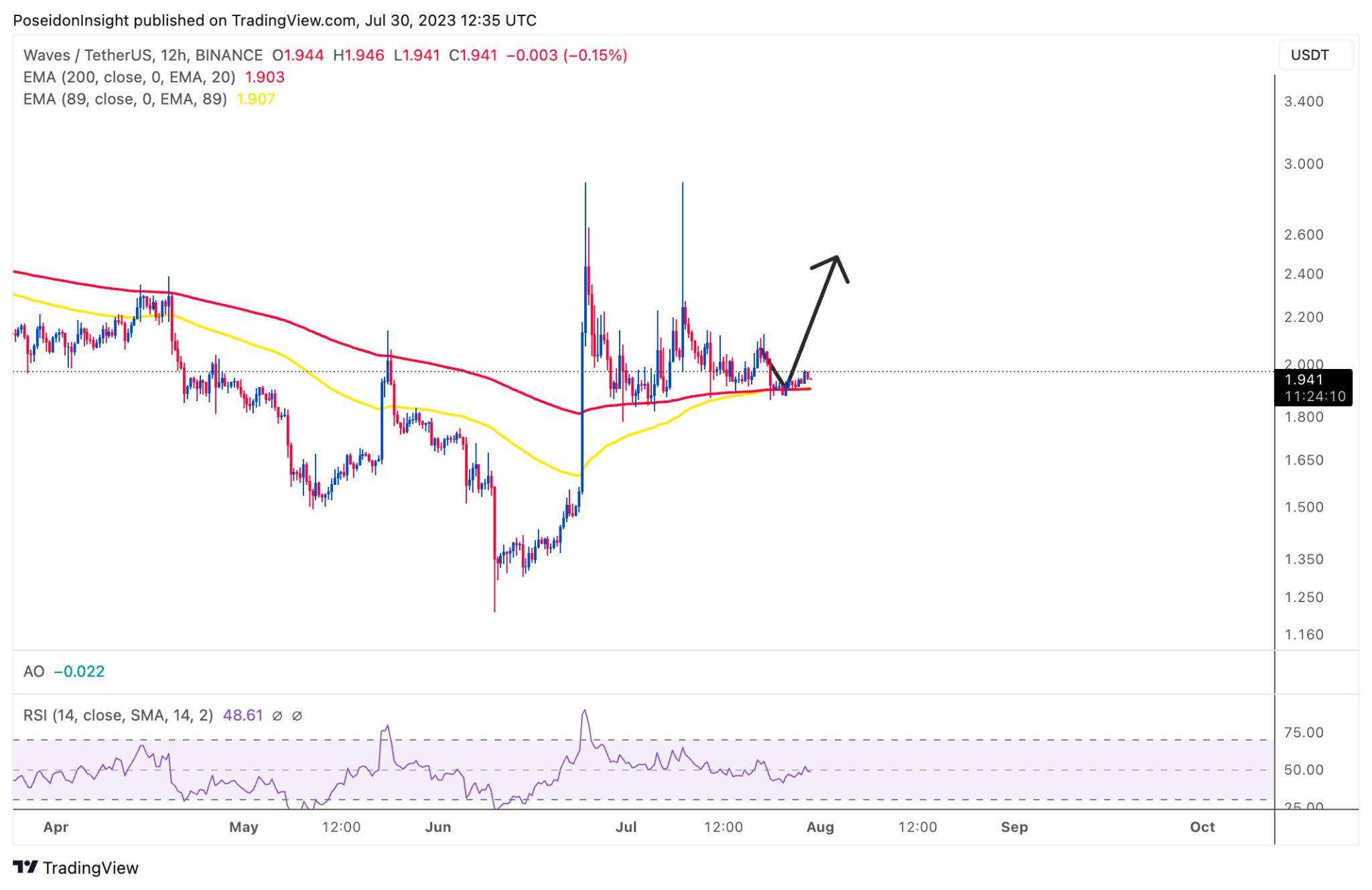 Đồ thị 12h của cặp WAVES/USDT trên sàn Binance Futures, ảnh chụp màn hình TradingView vào tối ngày 30/07/2023