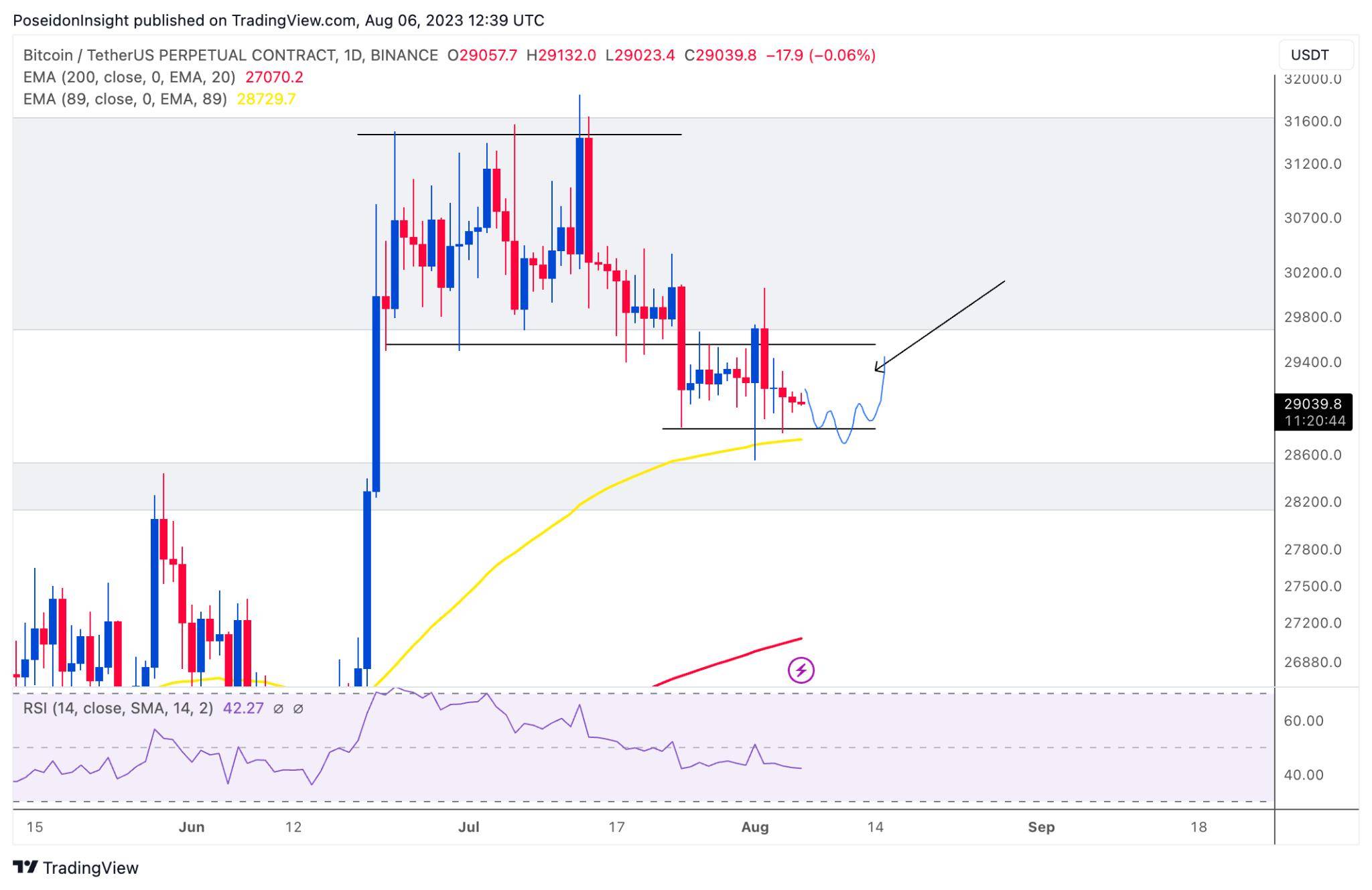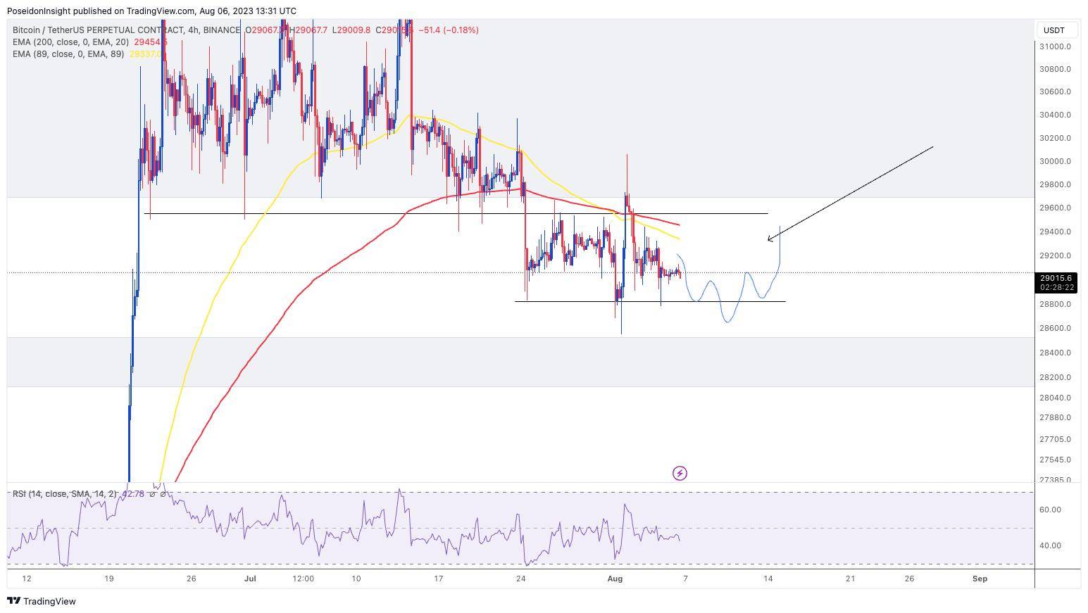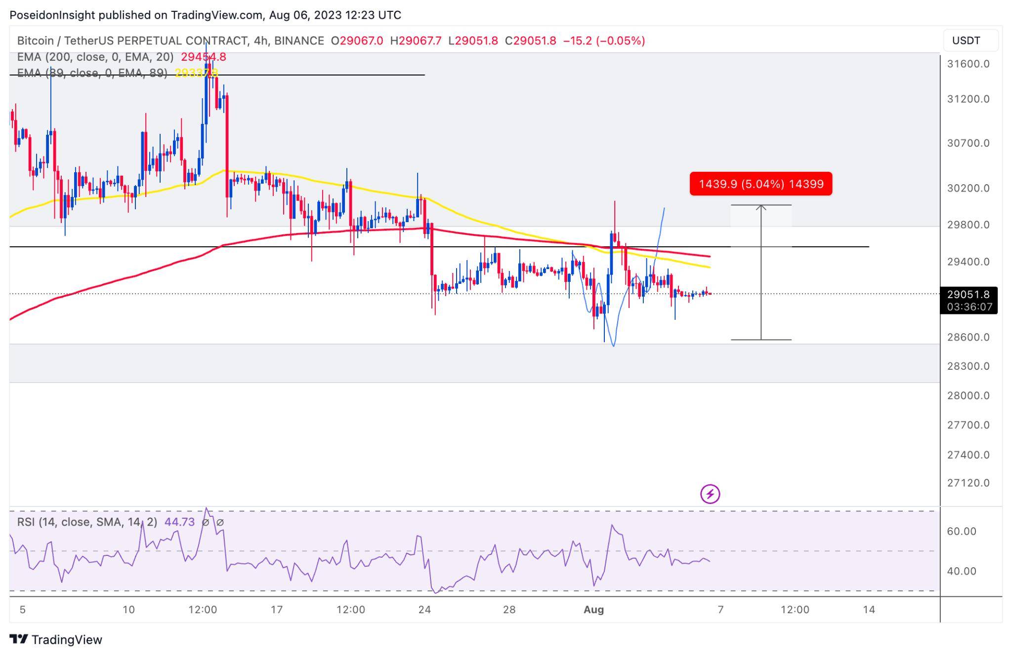 Đồ thị 4h của cặp BTC/USDT trên sàn Binance Futures, ảnh chụp màn hình TradingView vào tối ngày 06/08/2023