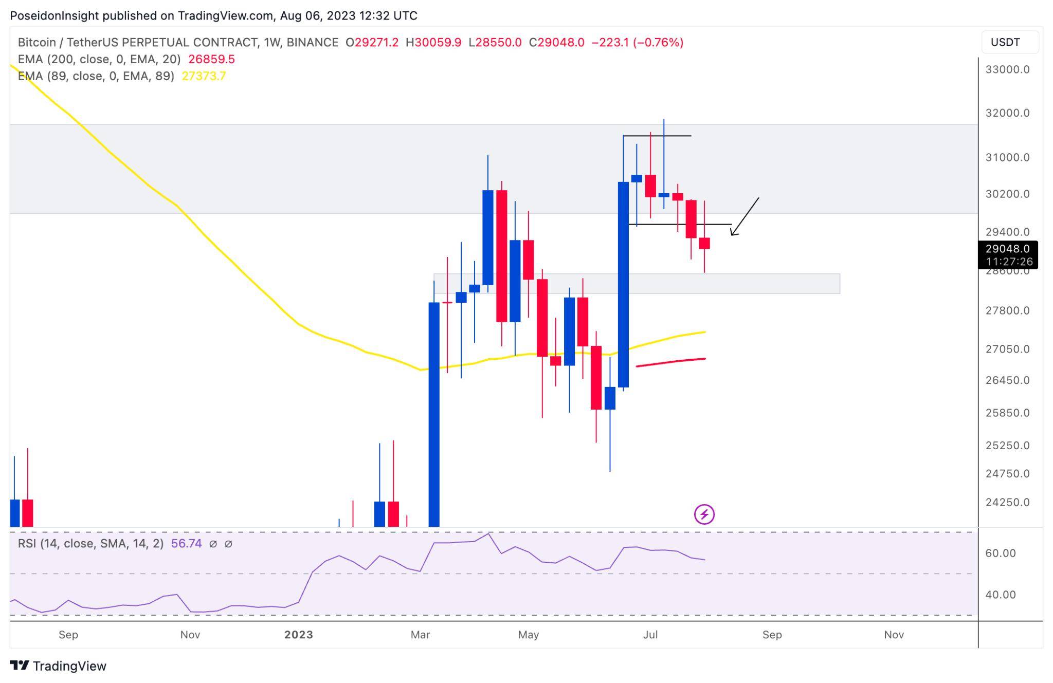 Đồ thị 1W của cặp BTC/USDT trên sàn Binance Futures, ảnh chụp màn hình TradingView vào tối ngày 06/08/2023