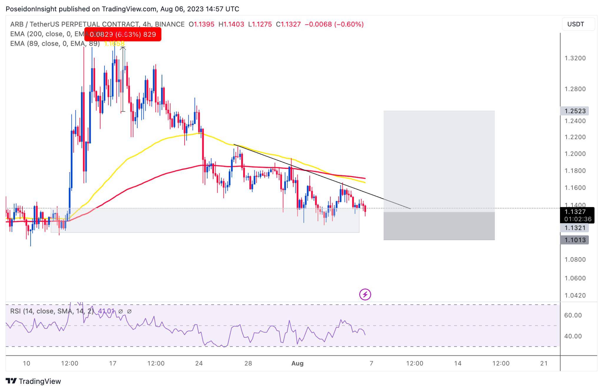 Đồ thị 4h của cặp ARB/USDT trên sàn Binance Futures, ảnh chụp màn hình TradingView vào tối ngày 06/08/2023