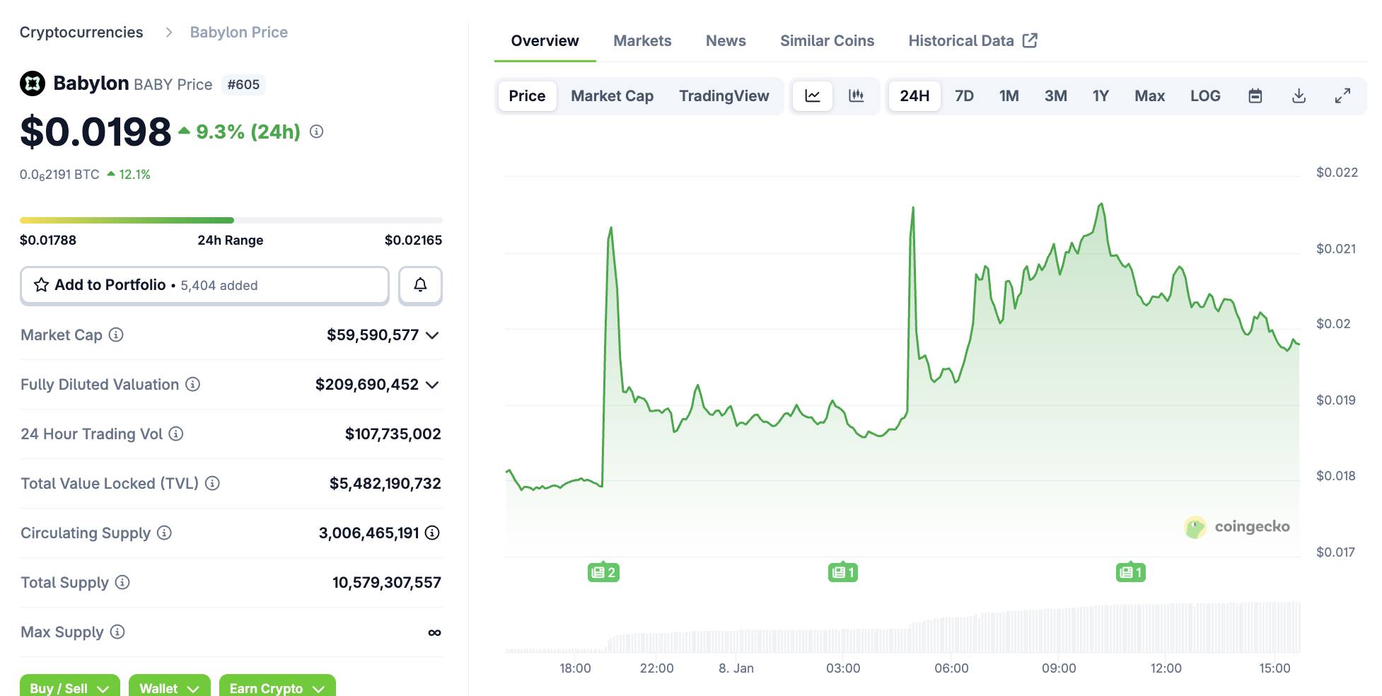 - Ngay sau thông tin trên, giá BABY đã tăng vọt hơn 9% trong 24 giờ qua và hiện đang dao động quanh mức 0,0198 USD.