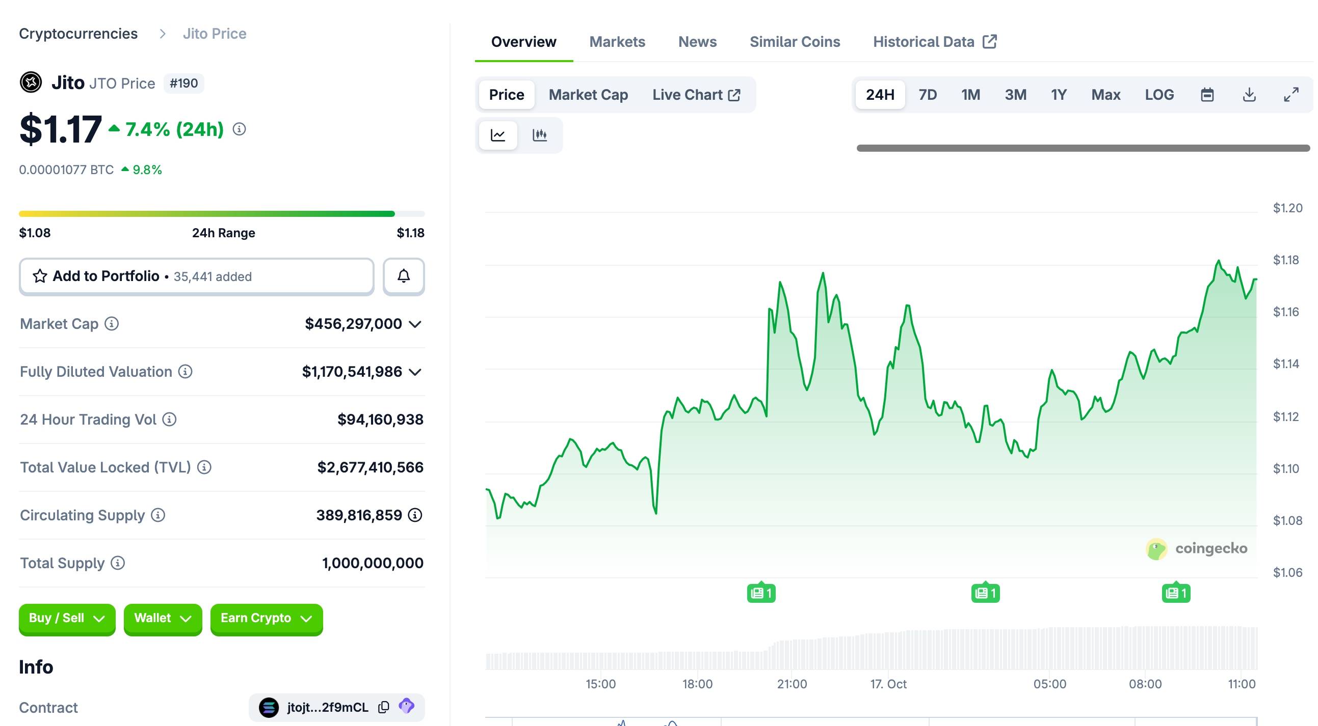 Biến động giá JTO trong 24h gần nhất, ảnh chụp màn hình trên CoinGecko lúc 09:50 AM ngày 17/10/2025