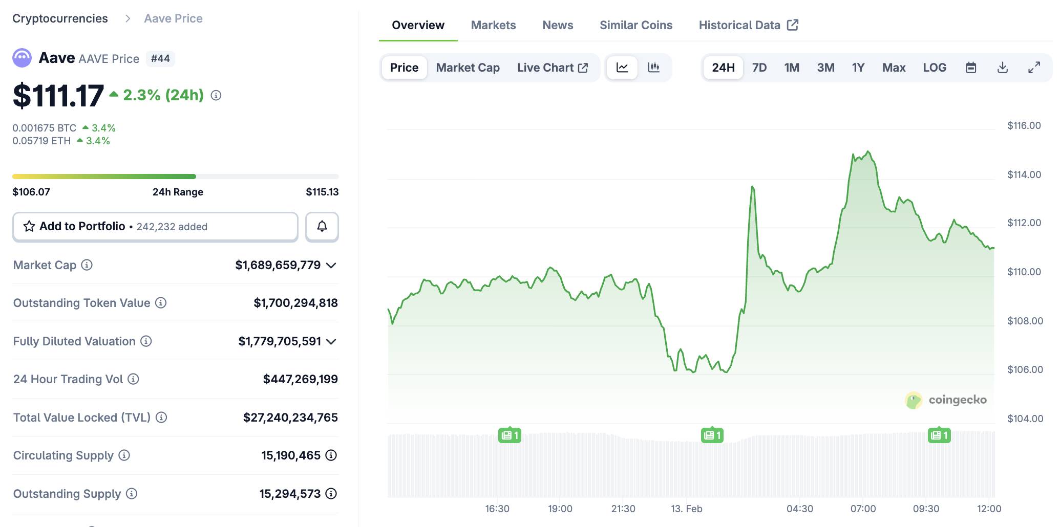 Biến động giá AAVE trong 24 giờ qua, ảnh chụp màn hình trên CoinGecko lúc 12:10 PM ngày 13/02/2026