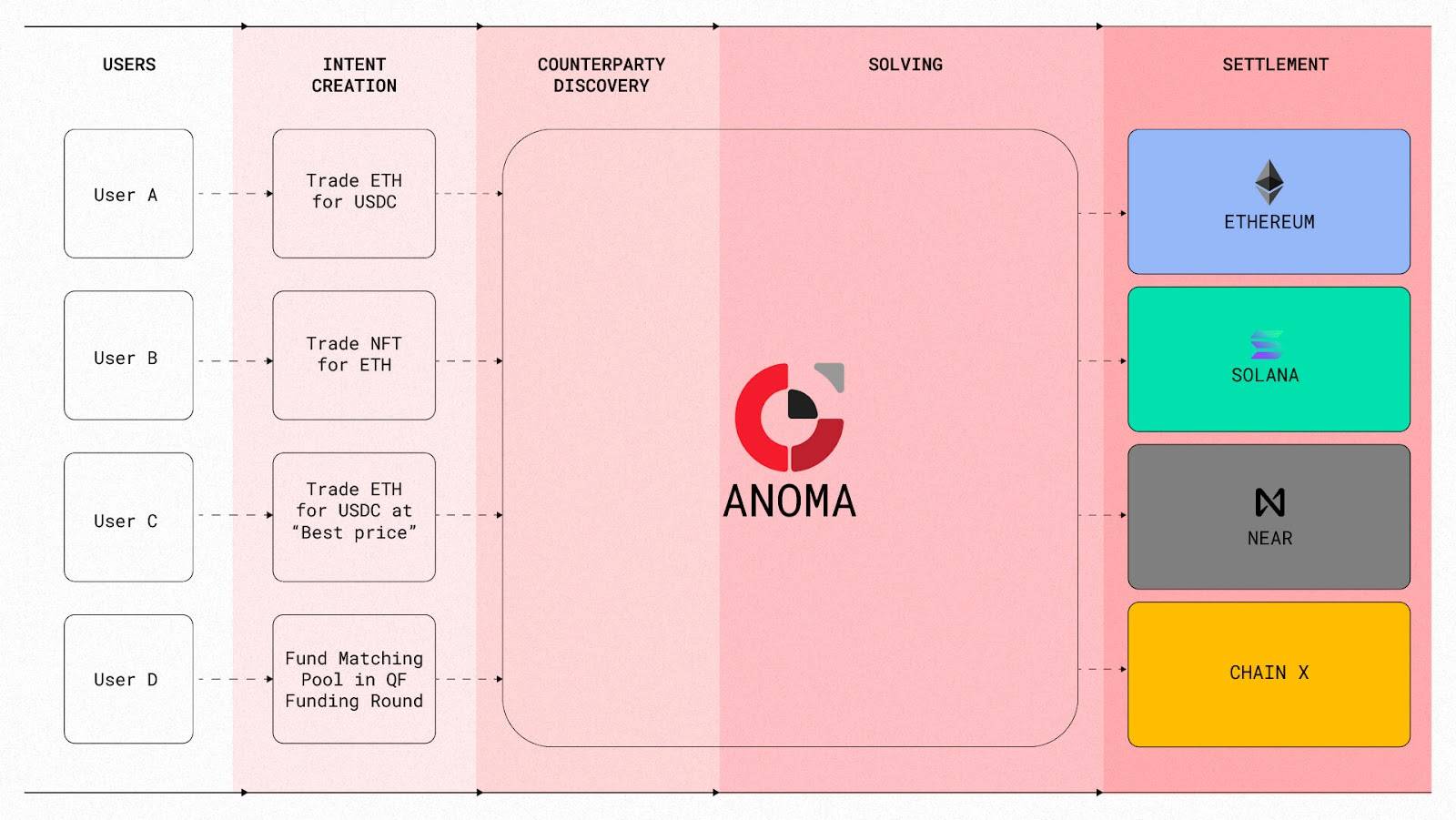 Ví dụ: Nếu người dùng muốn swap ETH sang USDC, họ chỉ cần đưa ra yêu cầu. Anoma sẽ tự động tìm mạng lưới thích hợp, chọn DEX có thanh khoản tốt, thực hiện swap ETH thành USDC và trả về ví của người dùng. Người dùng hoàn toàn không cần phải làm thêm bất kỳ điều gì sau khi đưa ra yêu cầu.