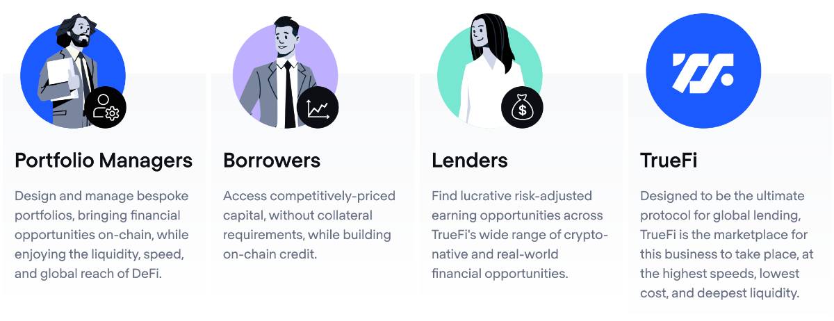 TrueFi chính là cầu nối giúp các tổ chức CeFi tiếp cận với DeFi thông qua mạng lưới lender (người cho vay) và borrower (người vay) lớn với nguồn thanh khoản dồi dào trong nền tảng. Dù TrueFi đã chuyển quyền quản lý sang cho TrueFi DAO nhưng Archblock vẫn tiếp tục là đơn vị đóng góp chính cho TrueFi. Các thực thể trong TrueFi bao gồm: