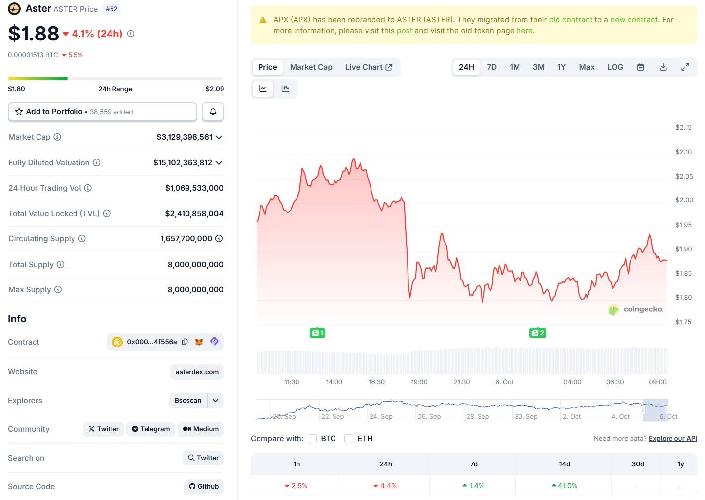 Biến động giá ASTER trong 24h gần nhất, ảnh chụp màn hình CoinGecko vào 09:30 AM ngày 06/10/2025