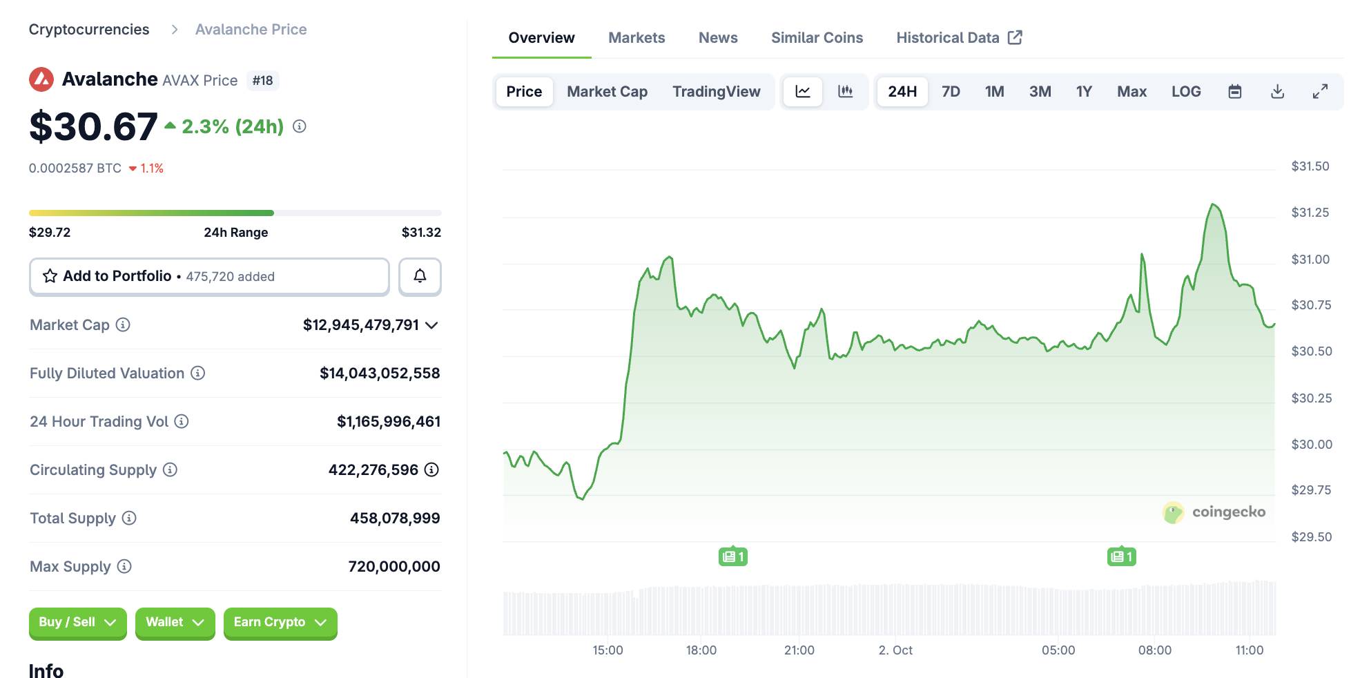 - Giá AVAX cũng ghi nhận mức tăng 2,3% trong 24 giờ qua và hiện đang dao động quanh mức 30,67 USD tại thời điểm viết bài.