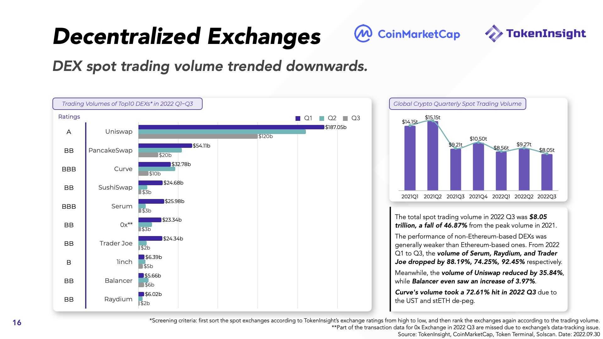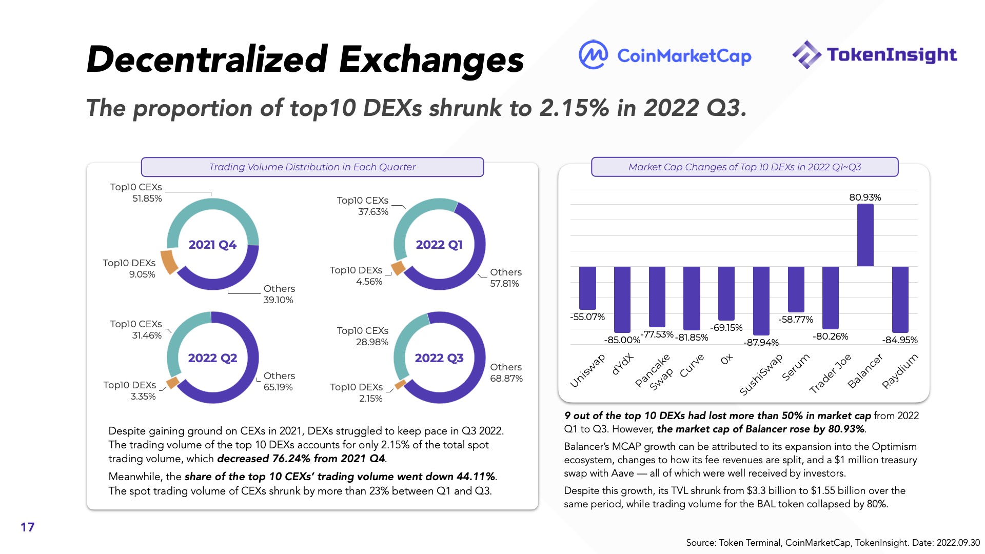 Tổng khối lượng giao dịch spot đã giảm 46,87% so với mức đỉnh vào quý 2 năm 2021. Mặc dù tăng điểm trên CEX vào năm 2021, các DEX đã phải vật lộn để giữ tốc độ trong Quý 3 năm 2022. Khối lượng giao dịch của 10 DEX hàng đầu chỉ chiếm 2,15% tổng khối lượng giao dịch giao ngay. Ngoài ra, 9 trong số 10 DEX hàng đầu đã mất hơn 50% vốn hóa thị trường từ Q1 đến Q3 2022, với Balancer là ngoại lệ duy nhất.