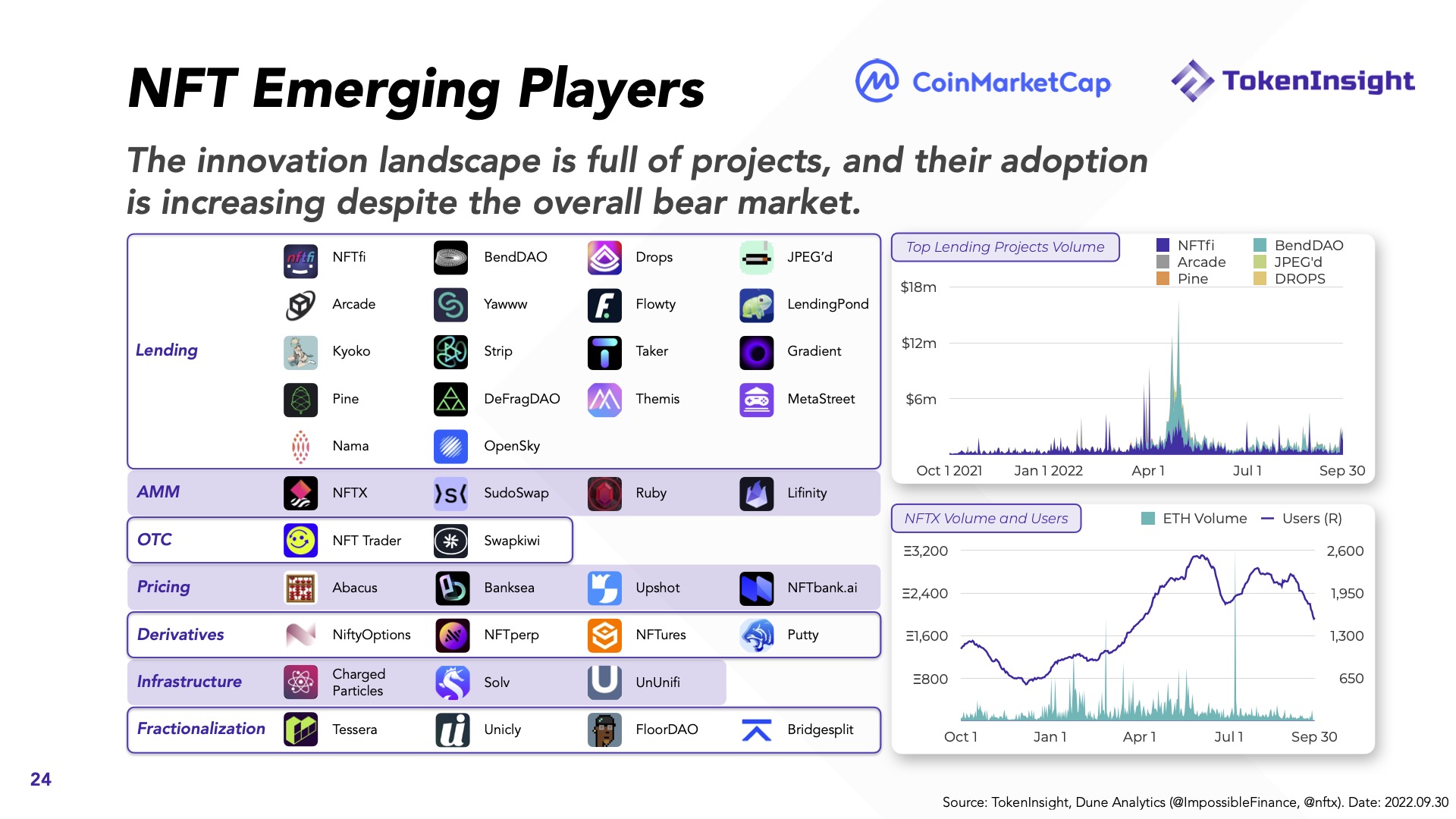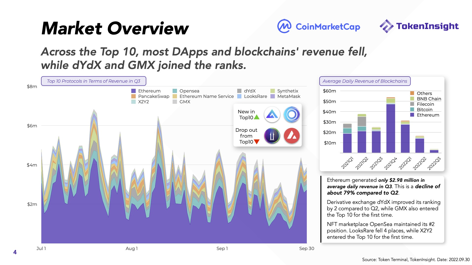 Sàn giao dịch phái sinh dYdX và GMX đã chứng kiến doanh thu được cải thiện trong quý này. Sàn giao dịch NFT OpenSea duy trì vị trí số 2. LookRare giảm bốn bậc, trong khi X2Y2 lần đầu tiên lọt vào Top 10.