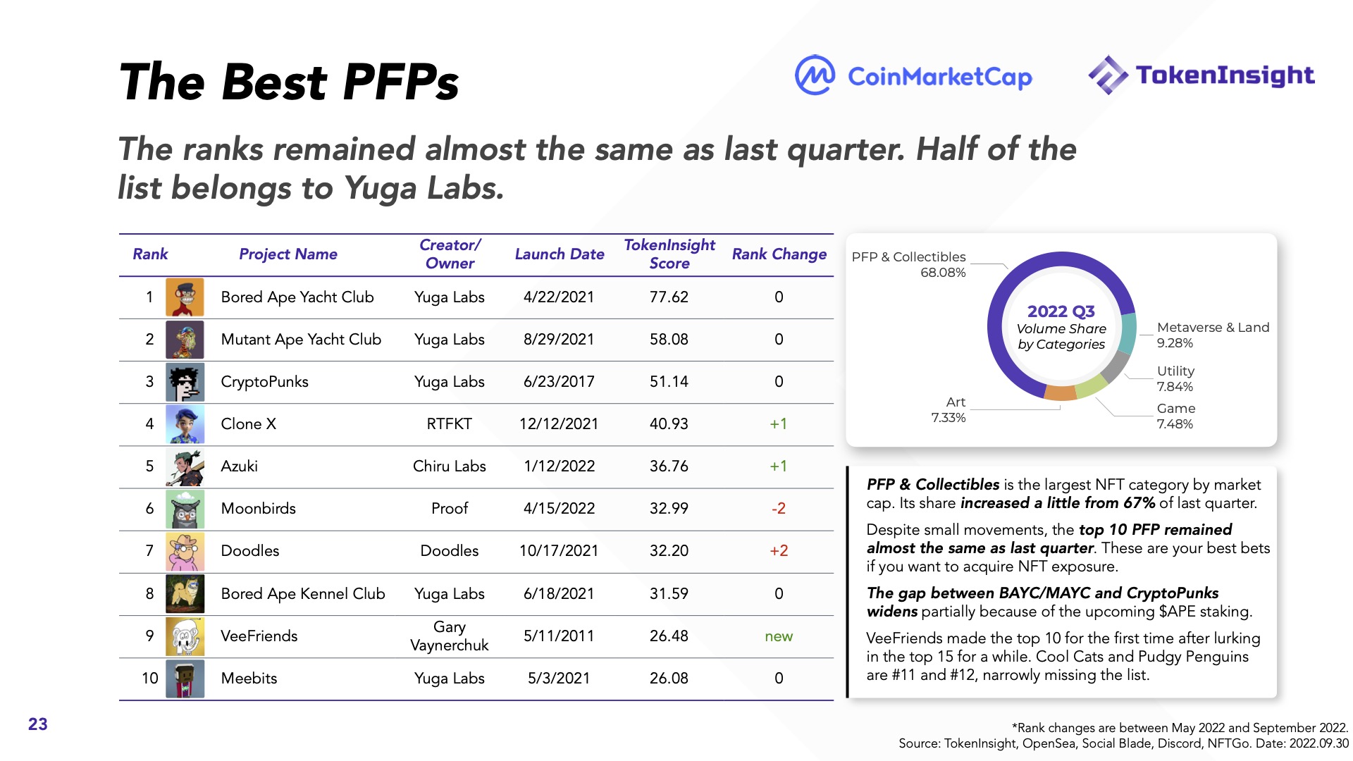 Mặc dù có những biến động nhỏ, 10 PFP hàng đầu vẫn gần như giữ nguyên so với quý trước, với sự bổ sung mới của VeeFriends .