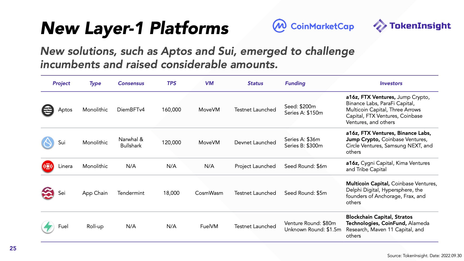 Các dự án mới, chẳng hạn như Aptos và Sui, đã xuất hiện để thách thức những dự án hiện tại và huy động được một lượng vốn đầu tư đáng kể.