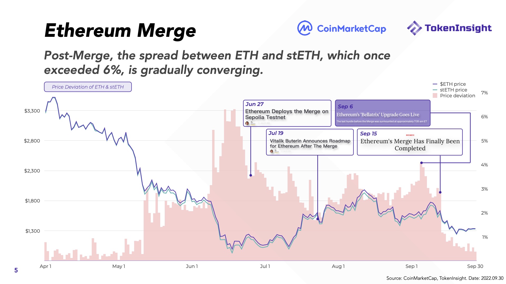 Sau The Merge, chênh lệch giữa ETH và stETH đang dần thu hẹp lại dù có lúc tách biệt đến 6%.