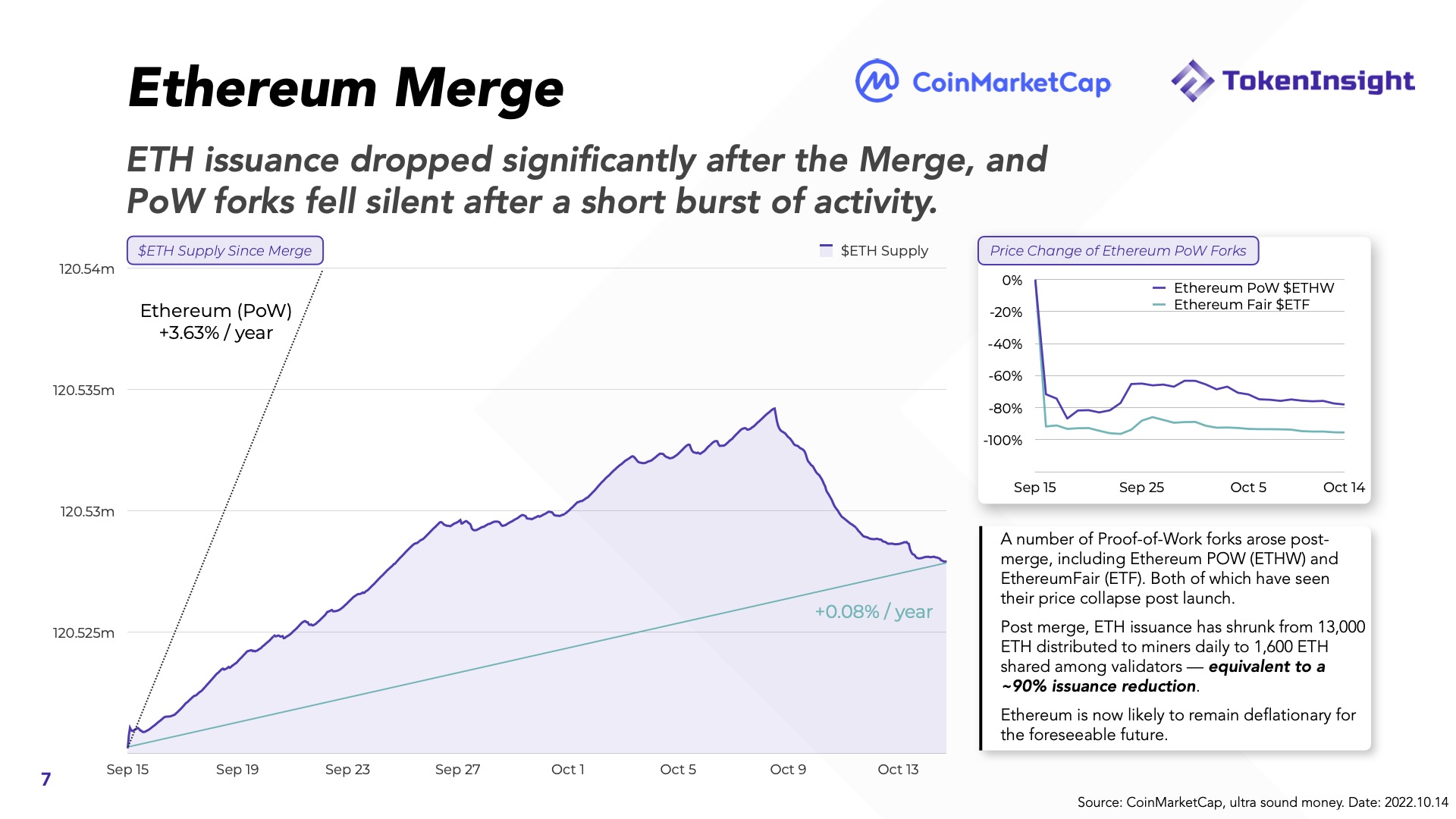 Lượng cung ETH mới phát hành đã giảm đáng kể sau The Merge và các bản fork PoW đã nhanh chóng “im hơi lặng tiếng” sau một thời gian ngắn hoạt động bùng nổ.