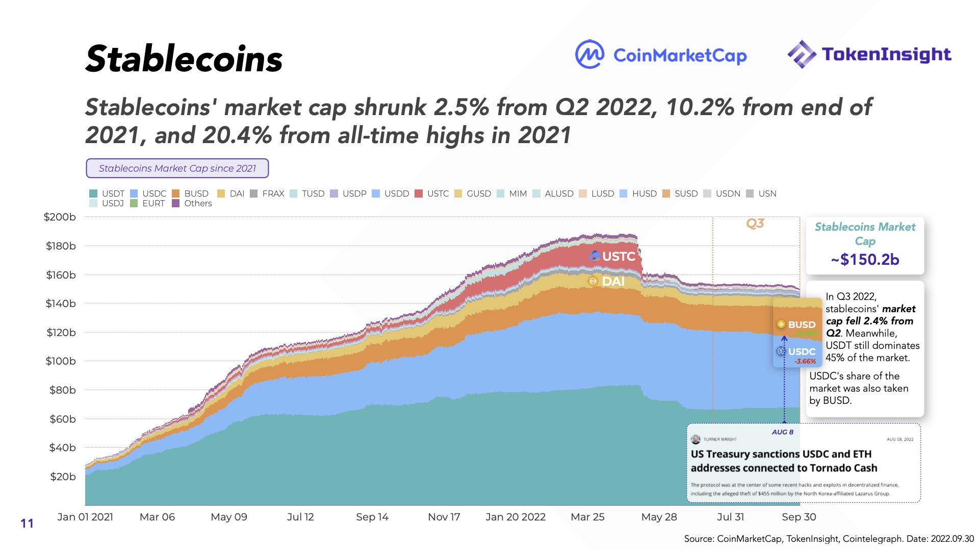 Trong quý 3 năm 2022, vốn hóa thị trường của stablecoin giảm 2,4%. USDT vẫn chiếm lĩnh 45% thị trường, trong khi BUSD đang dần chiếm thị phần của USDC.