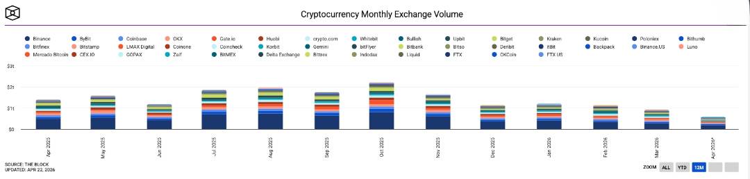 Khối lượng giao dịch trên các sàn crypto hàng đầu. Nguồn: The Block (23/04/2026)