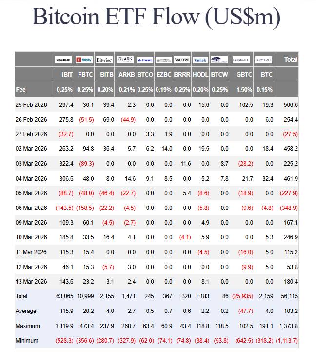 Thống kê dòng tiền của các quỹ ETF Bitcoin. Nguồn: Farside Investor (Ngày 16/03/2026)
