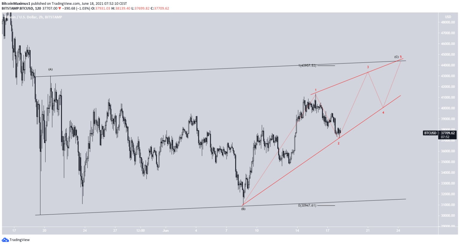 Một cách đếm sóng thay thế khác chỉ ra rằng chuyển động hiện tại là một tam giác sóng thứ tư. Trong trường hợp này, giá có thể giảm xuống đường hỗ trợ ở mức 33.000 USD một lần nữa trước khi thực hiện một chuyển động tăng khác về mức hiện tại. Sau đó, một mức giảm tương tự có thể theo sau.
