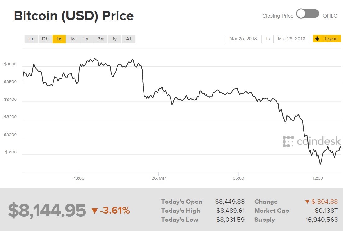 Tại thời điểm thực hiện bài viết, Bitcoin đã giảm về mức $8,100 – thấp nhất trong cả tuần vừa rồi.
