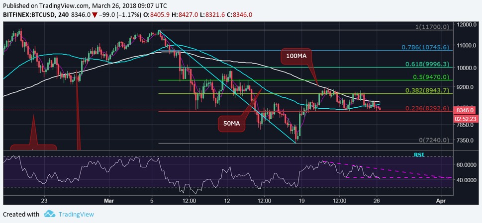 • BTC nhiều khả năng sẽ đâm qua vùng ủng hộ $8,200 và test lại mức $7,240 (mức đáy gần nhất) trong ngắn hạn.