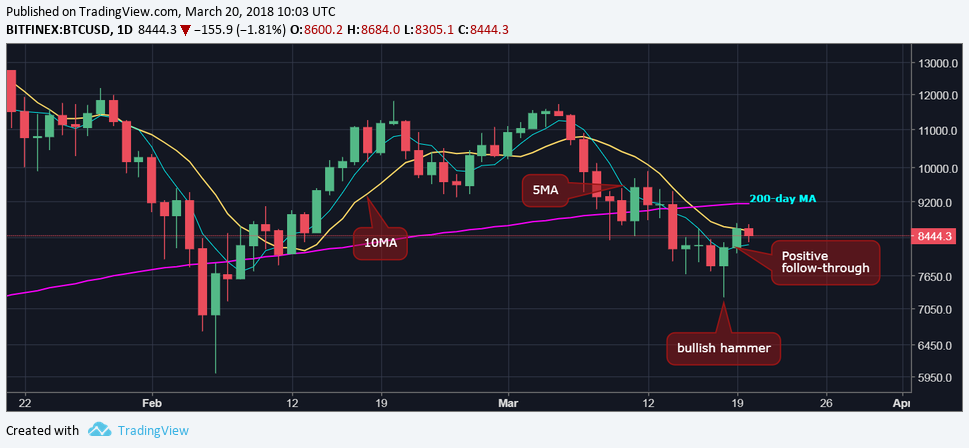 Trong 48 tiếng gần nhất, Bitcoin đã hồi phục lại gần 30% những thiệt hại sau đợt mất giá từ $11,660 (mức cao của ngày 05/03) về $7,335 (mức cao của ngày 18/03). Bên cạnh đó, đồng tiền điện tử số 1 thế giới đã chứng kiến việc giá vượt qua đường xu hướng giảm trong ngày hôm qua. Do đó, có thể an toàn khi khẳng định BTC đã tìm thấy đáy ngắn hạn của mình.