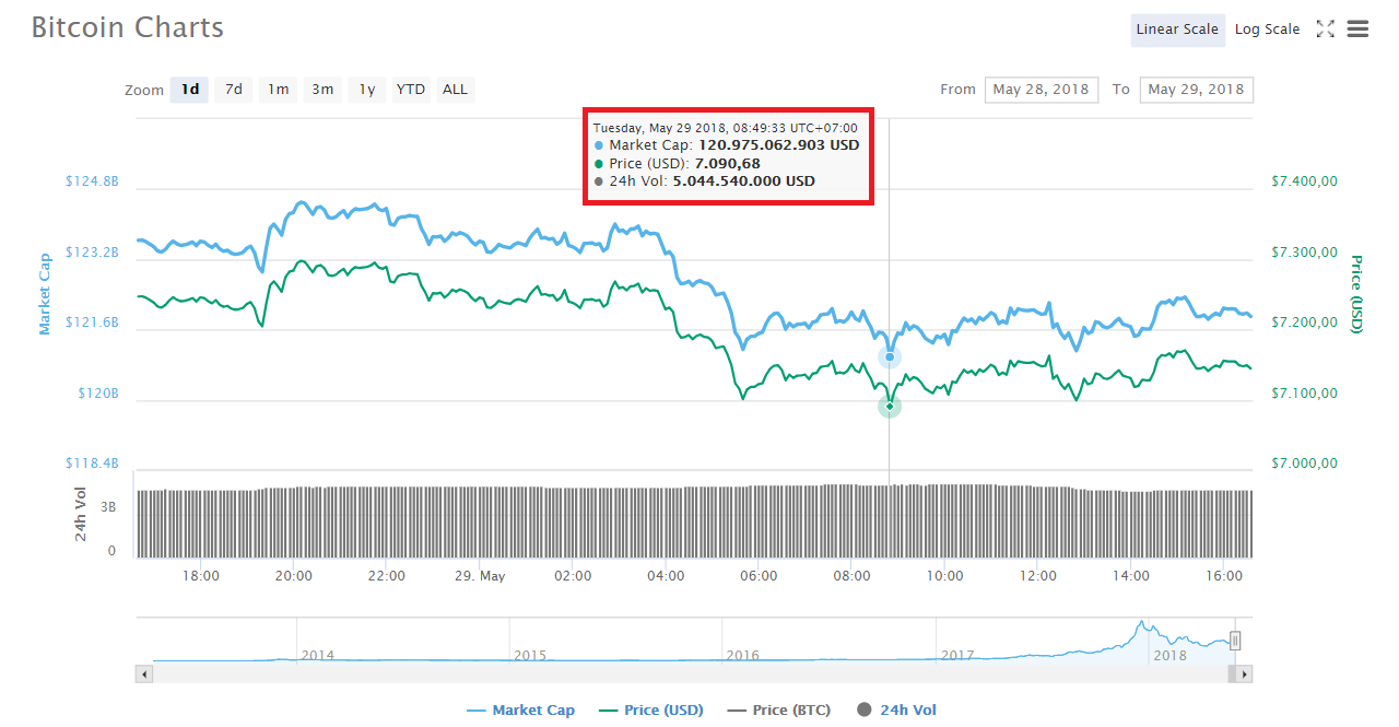 Giá BTC tiếp tục suy giảm trong ngày hôm nay, chạm đáy 7 tuần ở $7,090.
