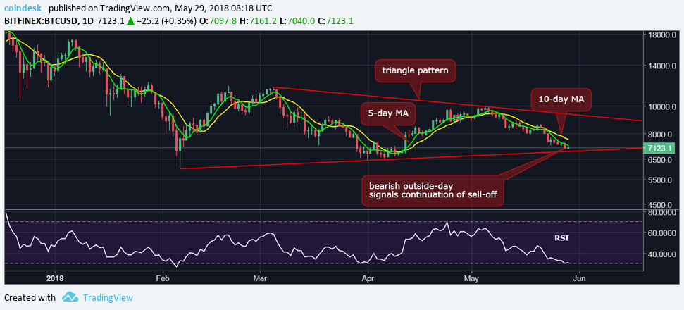 Biểu đồ giá Bitcoin đã ghi nhận một nến doji vào ngày Chủ nhật, cho thấy quá trình sụt giảm đã tạm thời hết hơi. Tuy nhiên, một đợt tăng trưởng phục hồi vẫn còn rất xa vời khi đồng tiền điện tử số 1 thế giới đã không thể vượt qua mức $7,400 và đóng nến giao dịch hôm 28/05 (tính theo giờ UTC) tại mốc $7,143 – thấp nhất kể từ ngày 12/04, theo dữ liệu từ sàn Bitfinex.