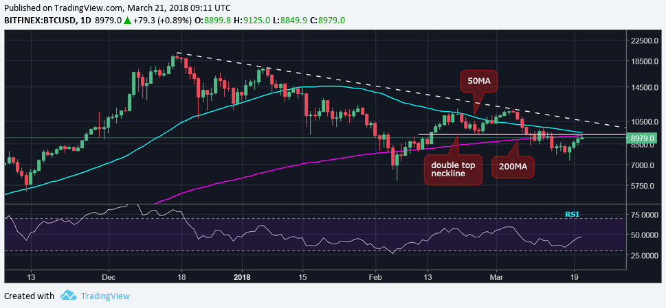 • Giá tự củng cố quanh khu vực $9,000 có thể sẽ lại kích hoạt thêm một đợt bán tháo nữa. Kịch bản tệ nhất là Bitcoin sẽ tụt về lại đáy $6,000 của tháng 2.