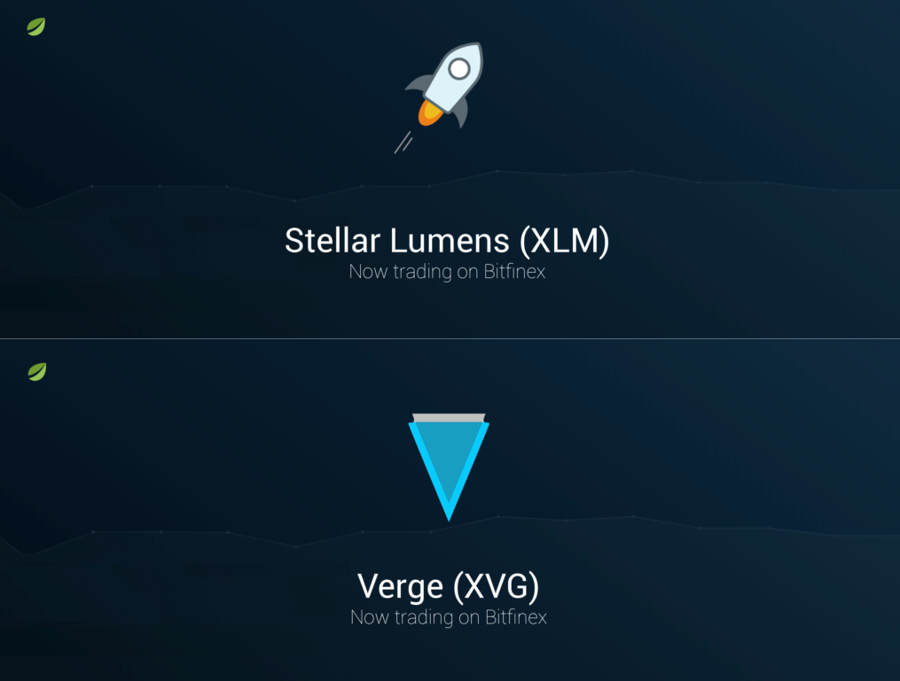 Sàn giao dịch Bitfinex vừa với niêm yết thêm hai đồng tiền điện tử vào ngày 01/05, đó là Stellar (XLM) và Verge (XVG). Cả hai altcoin này đều đang thuộc top 30 đồng tiền có giá trị nhất, với Stellar xếp vị trí thứ 8 với vốn hoá thị trường 8,2 tỉ đô trong khi Verge đứng thứ 22, vốn hoá là 1,2 tỉ đô la Mỹ.