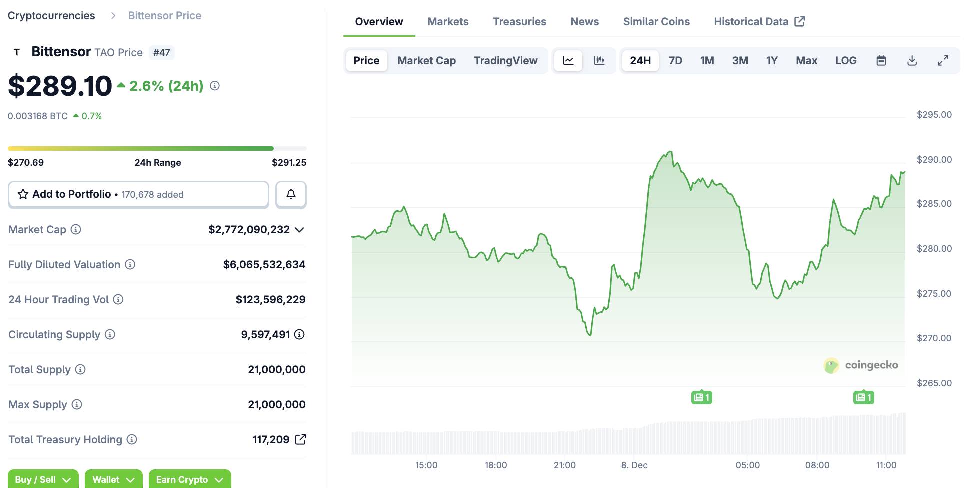 - Tại thời điểm viết bài, giá TAO hiện đang dao động quanh mức 289,08 USD, tăng nhẹ 2,5% trong 24 giờ qua.