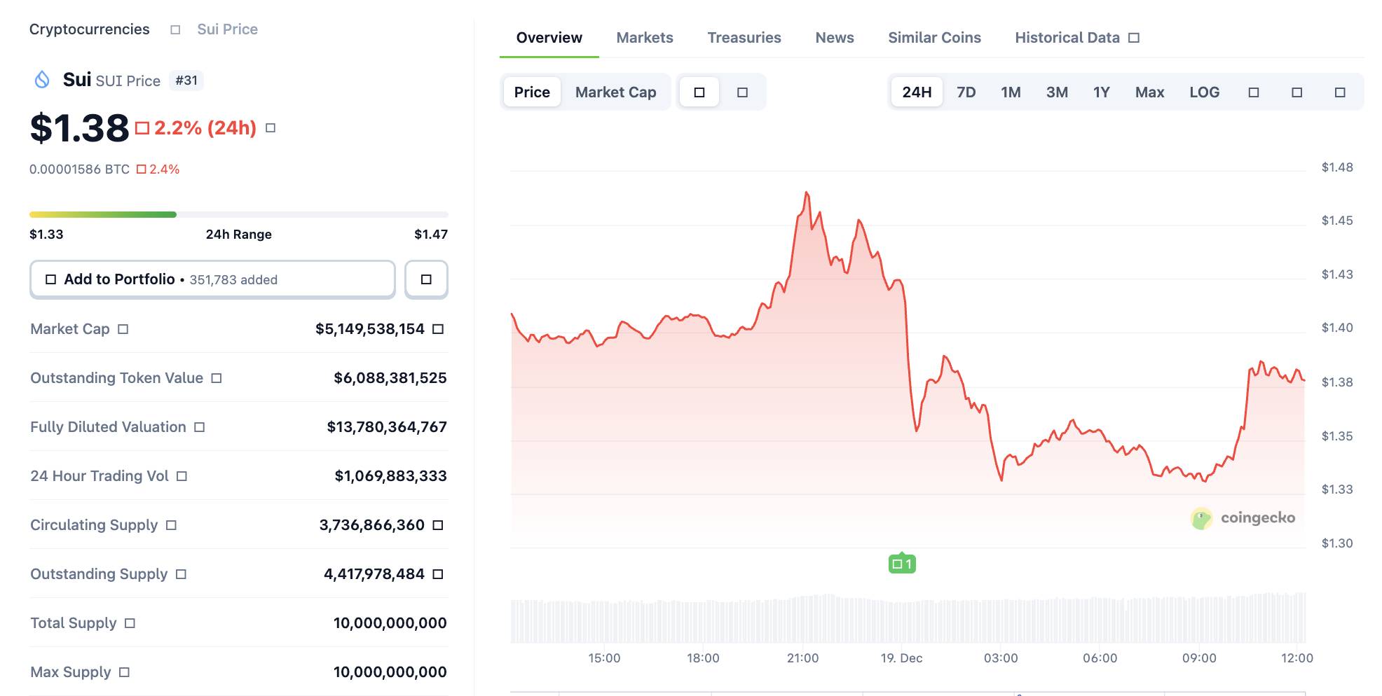 - Giá SUI trong 24 giờ qua không có quá nhiều biến động đáng kể, giảm nhẹ 2,2% và hiện đang dao động quanh mức 1,38 USD.