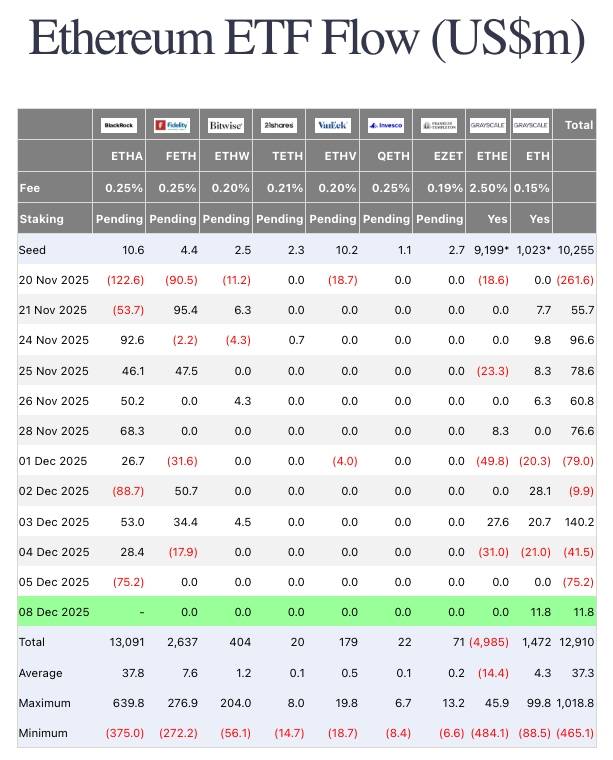 Thống kê dòng tiền inflow/outflow của các ETF Ethereum. Nguồn: Farside Investors (09/12/2025)
