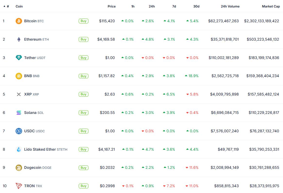 Xếp hạng 10 đồng tiền mã hoá có giá trị vốn hoá lớn nhất thị trường. Ảnh: CoinGecko ngày 27/10/2025