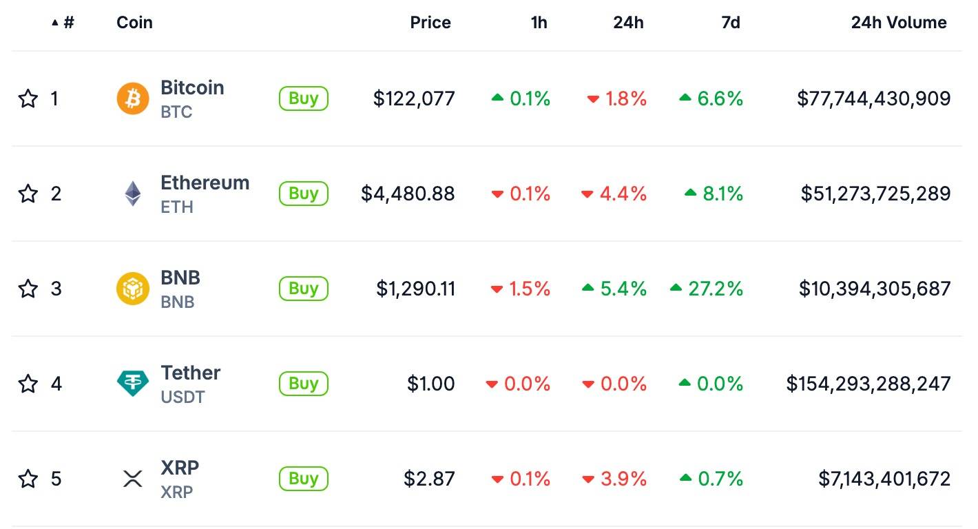 Top 5 đồng coin lớn nhất thị trường crypto tính theo vốn hoá. Nguồn: CoinGecko (08/10/2025)