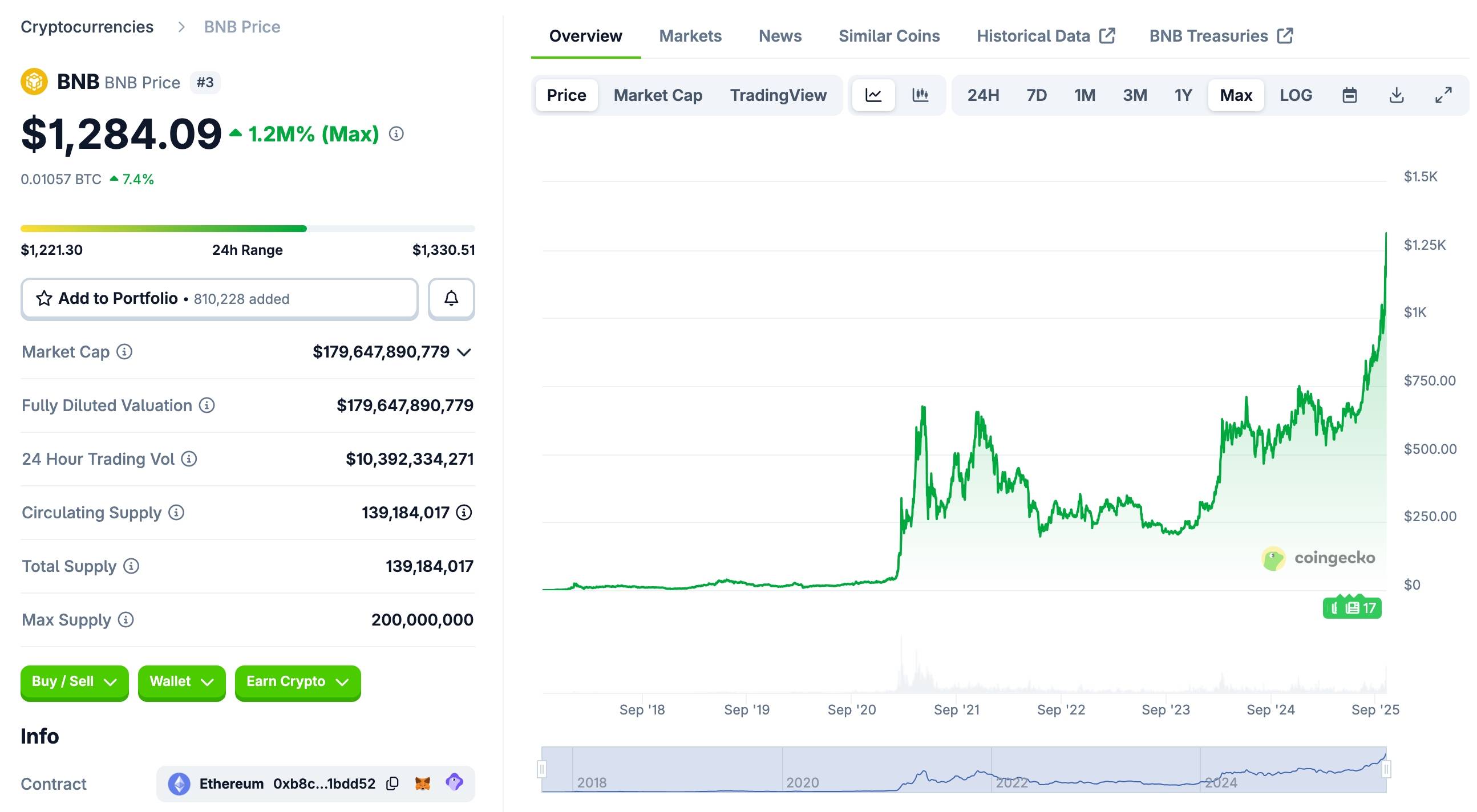 BNB lập đỉnh lịch sử trên 1.280 USD, lọt top 3 vốn hoá thị trường. Ảnh: X