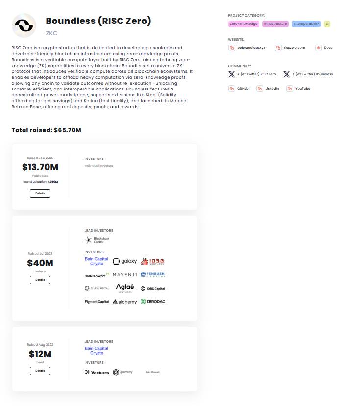 Boundless đã trải qua nhiều vòng gọi vốn quan trọng để xây dựng hạ tầng ZK. Vào tháng 8 năm 2022, dự án huy động được 12 triệu USD trong vòng seed, mở đường cho giai đoạn phát triển ban đầu. Đến tháng 7 năm 2023, Boundless tiếp tục khẳng định sức hút khi gọi thành công 40 triệu USD ở vòng Series A. Gần đây nhất, vào tháng 9 năm 2025, dự án hoàn tất public sale với quy mô khoảng 13,7 triệu USD, đưa định giá vòng đạt mức 290 triệu USD. Tổng cộng, Boundless đã huy động được hơn 65 triệu USD.