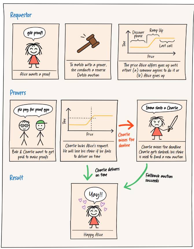 - Tài chính hóa tính toán (Financialization of Compute): Biến năng lực tính toán thành một loại hàng hóa có thể giao dịch trong thị trường phi tập trung. Boundless tổ chức cơ chế đấu giá Dutch ngược, đảm bảo người yêu cầu bằng chứng đạt được mức giá hợp lý và cạnh tranh, đồng thời duy trì tính thanh khoản tính toán và ngăn ngừa độc quyền.