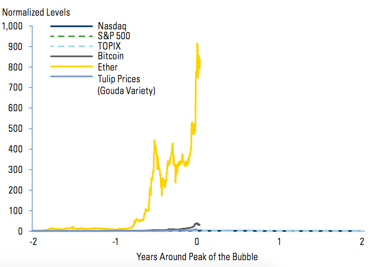 Mossavar-Rahmani nói rằng biến động giá của TOPIX và Nasdaq nhìn “chỉ như là những dòng kẻ phẳng lì” nếu mang so với các tiền điện tử, và kể cả khi so sánh với bong bóng hoa tulip Hà Lan hồi những năm 1600 thì sự bơm phồng giá Bitcoin vẫn tỏ ra vượt trội hoàn toàn. Bà còn nhận xét rằng giá Ethereum thậm chí còn “đạt kích thước khổng lồ hơn”, thể hiện qua việc bong bóng của nó còn lớn hơn nhiều lần của Bitcoin.